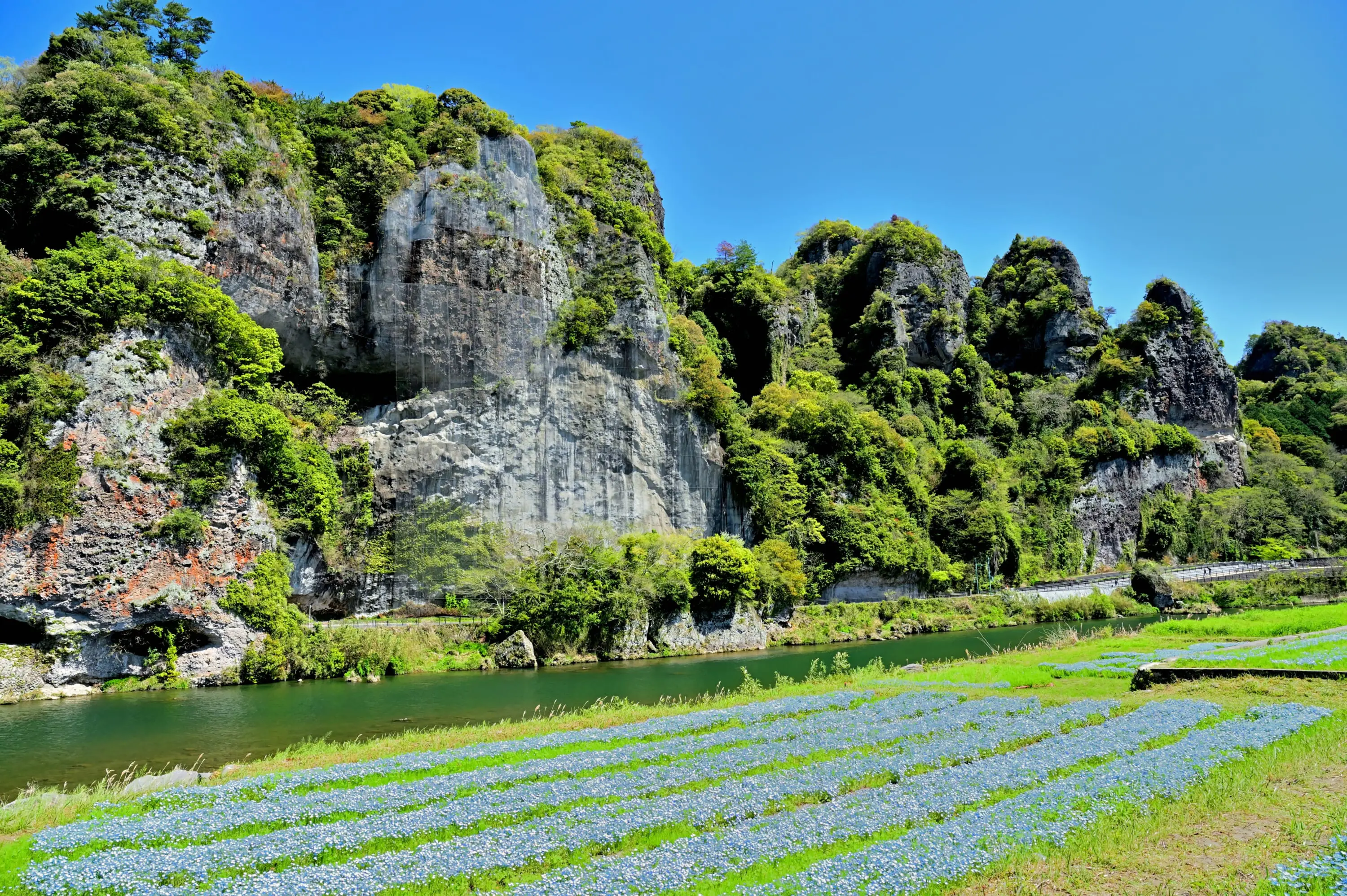 For the adventurous history buffs, this magnificent site features a cave tunnel that was reportedly hand-carved by Yabakei Gorge Aonodomon Tunnel. Since 2012, nemophila have been planted along the opposing banks of the gorge that adorn the landscape from mid-April through to early May. The name Aonodomon, or “Blue Cave,” takes on added significance when surrounded by the blue nemophila flowers.