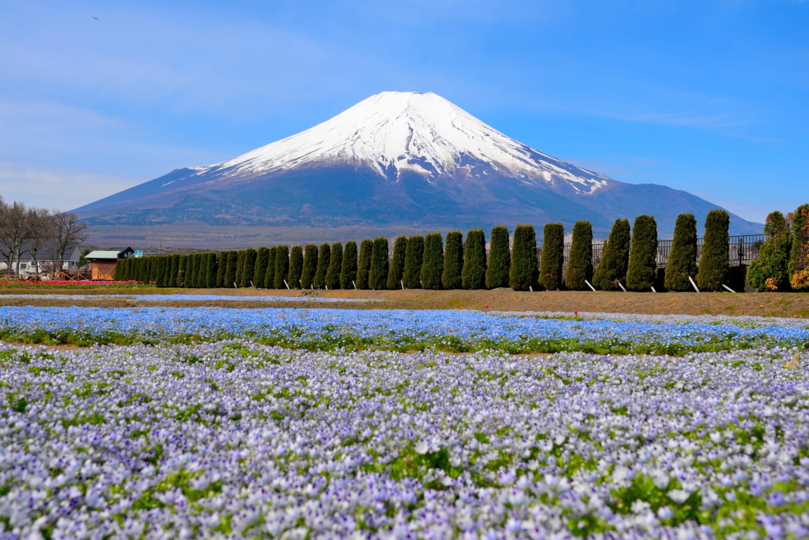 Situated at an elevation of 1,000 meters on the shores of Lake Yamanaka, this flower park offers the experience of viewing nemophila blooms with the majestic Mount Fuji as a backdrop. The park’s Seiryu-no-Sato-Lake Garden area features family-friendly water splash zones as well as viewing spots for the stunning Myojin Waterfall. The park itself is quite expansive, so consider renting a bicycle to cover more ground.