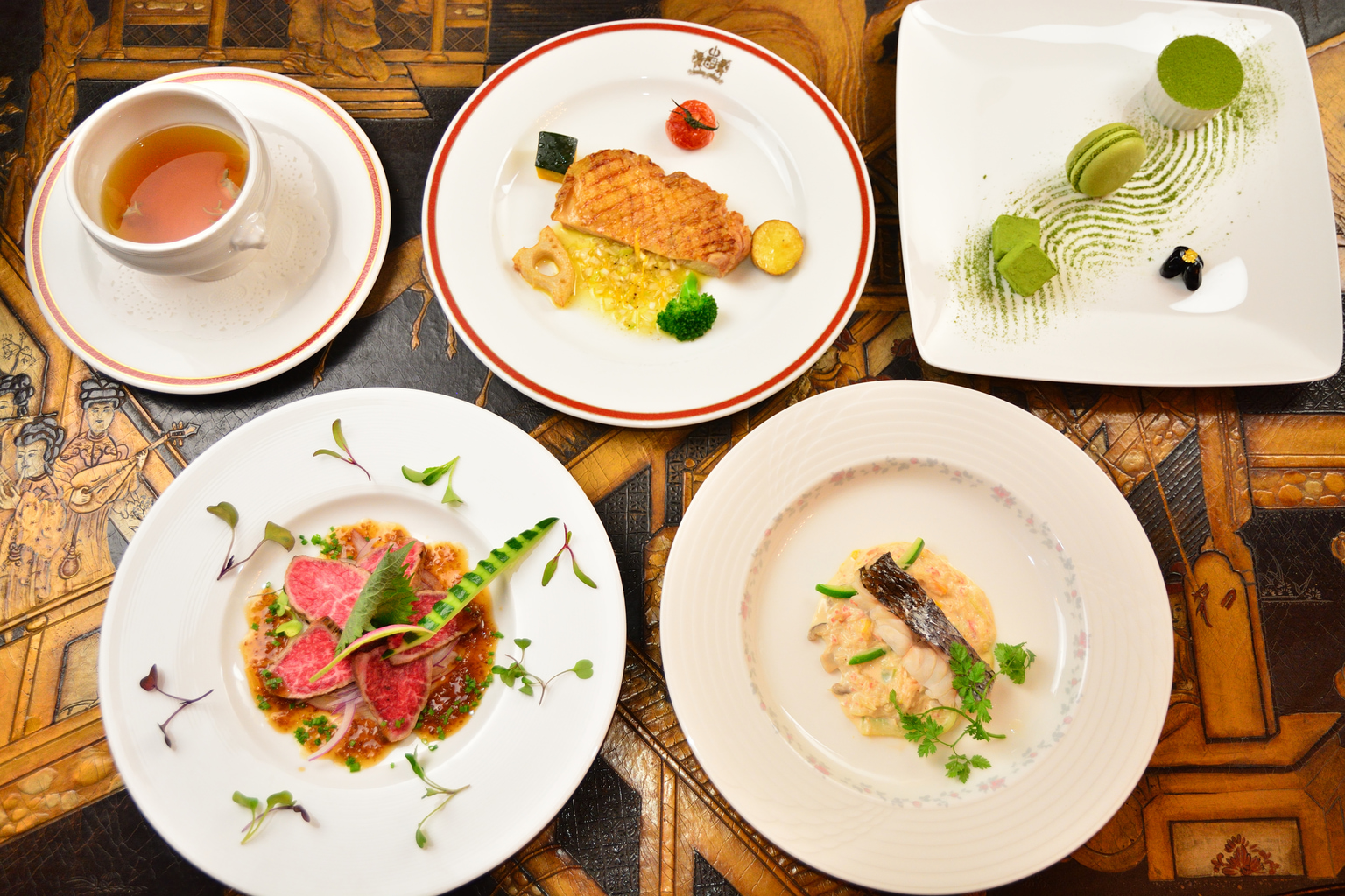 Matcha lovers will relish the dessert plate, which features three types of sweets inspired by Kyoto’s signature tea. Taking the form of tiramisu, macaron and chocolate ganache, the bitterness and depth of Kyoto matcha and the sweetness of chocolate marry to complete the meal. Arranged to look like a traditional Kyoto garden, it is perfect for one last Instagram snap of your very British evening.