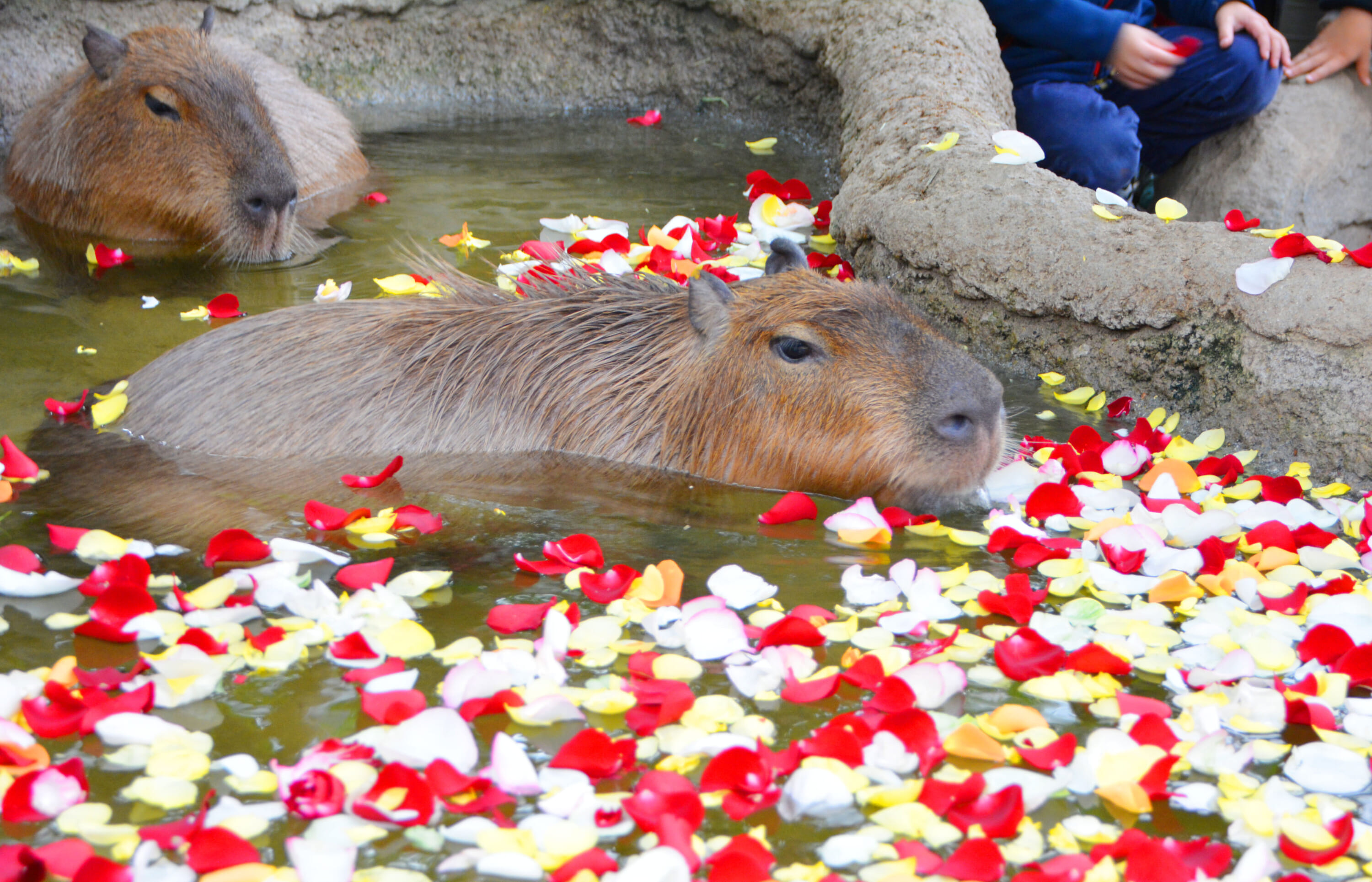 At Izu Shaboten Zoo, capybaras were the trailblazers of hot spring bathing. Today, the zoo has elevated the experience by adding fragrant yuzu citrus fruits to their spacious outdoor baths during winter. On weekdays, baths are prepared daily, while on weekends, there are two sessions each day. To keep things interesting, the bath contents rotate daily, featuring not only yuzu but also special baths with pineapples, broccoli and even roses on Valentine’s Day.