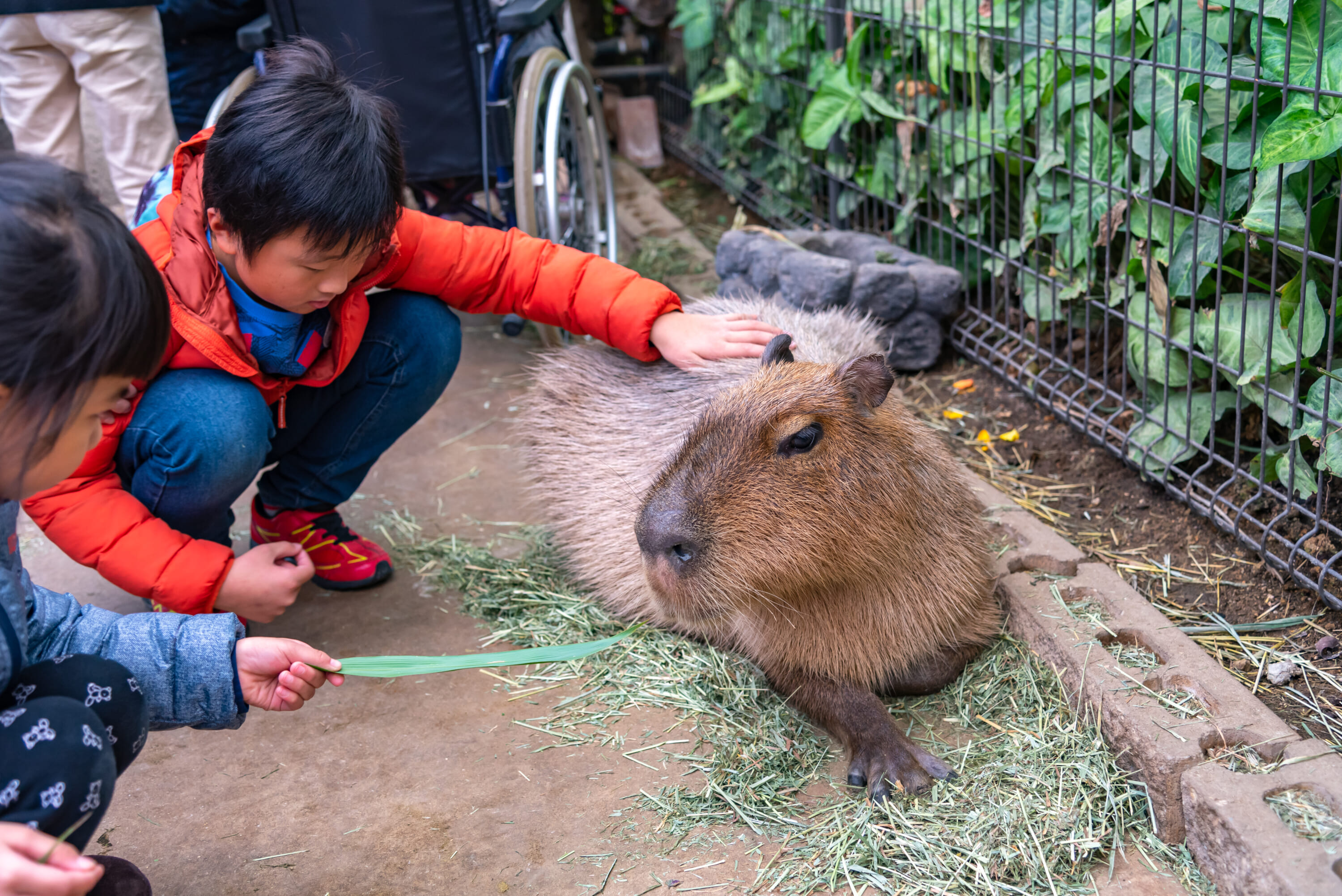 Nagasaki Bio Park in Kyushu offers an up-close and interactive experience with its capybaras. Besides its outdoor capybara onsen, this park stands out for its hands-on feeding opportunities, allowing you to give them scratches, while also watching them laze about in designated petting zones,