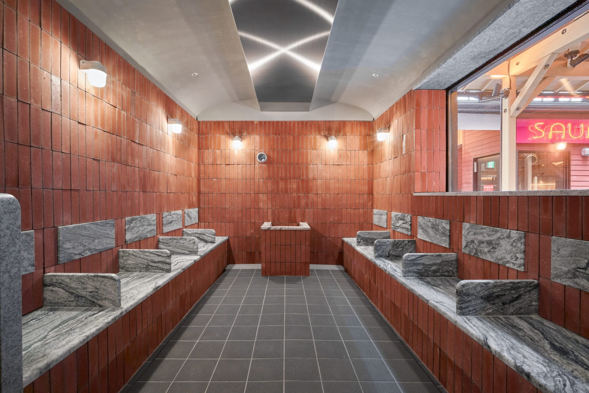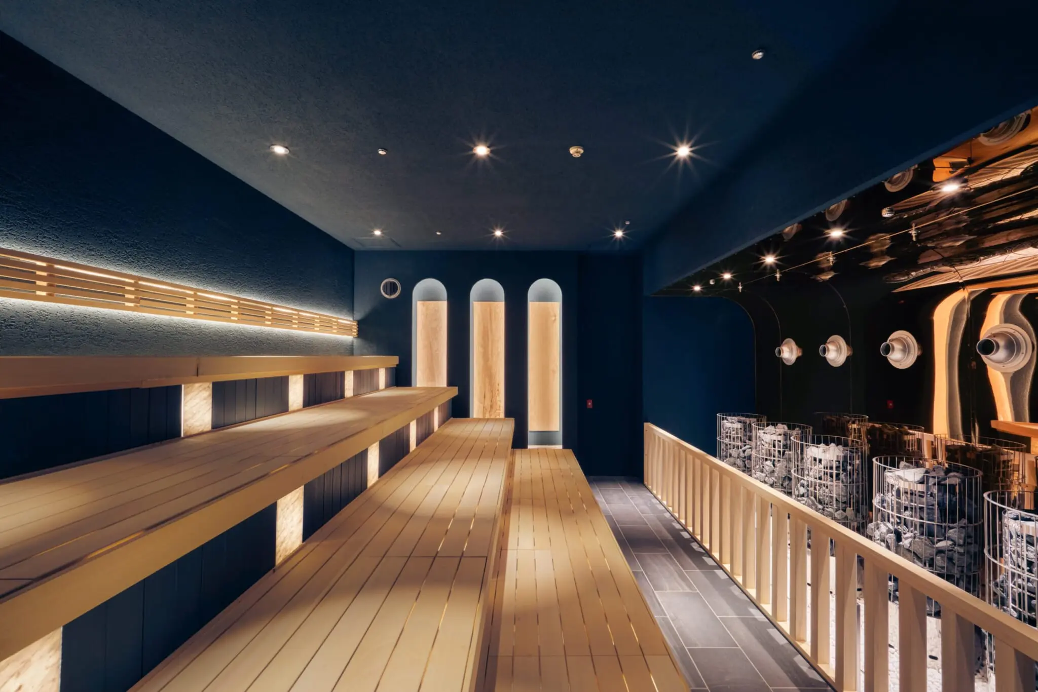 In Funabashi, Re: Sauna has multiple personal enclaves to secure solitary sauna time for its guests. Rooms are rented out in 60- or 80-minute increments and are limited to solo users — with the exception of the VIP room, which allows up to three people at a time. Each dimly lit suite is soundproofed and fitted with Bluetooth-enabled speakers, so sauna-goers can blast their favorite tunes to their heart’s content without worrying about the neighbors.