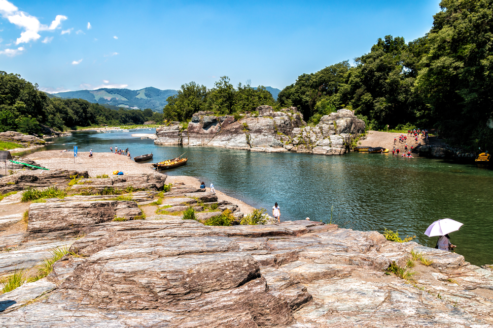 About 30 minutes outside of Chichibu city lies Nagatoro Iwadatami, a naturally occurring rock formation that is about 80m wide and 500m long. The formation itself is called ‘Iwadatami’ for its resemblance to tatami mats. This is a great area to explore on a sunny day, as you can climb over rocks, observe fish in the clear stream or catch a ride on a tour boat to see Myojin Falls.