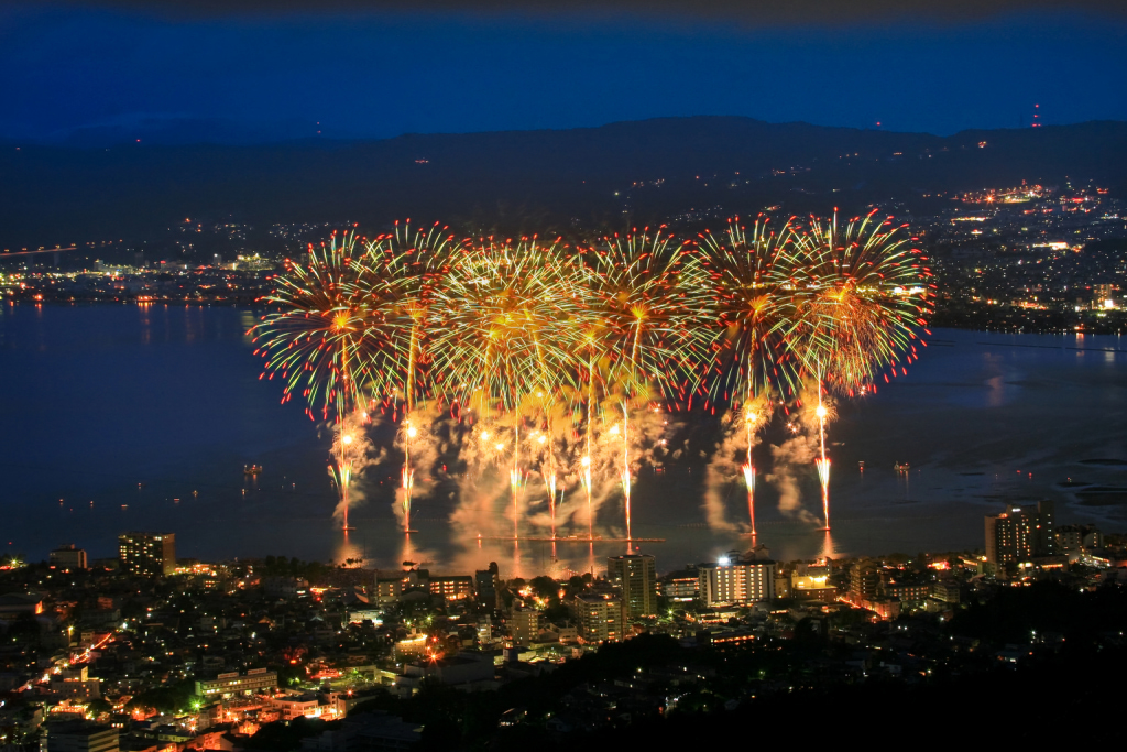 Located in the southwest corner of Nagano Prefecture, about three hours from Tokyo by train, Suwa Lake’s illuminations are impressive and the main show, considered by many to be Japan’s best fireworks exhibition, lasts for two hours.