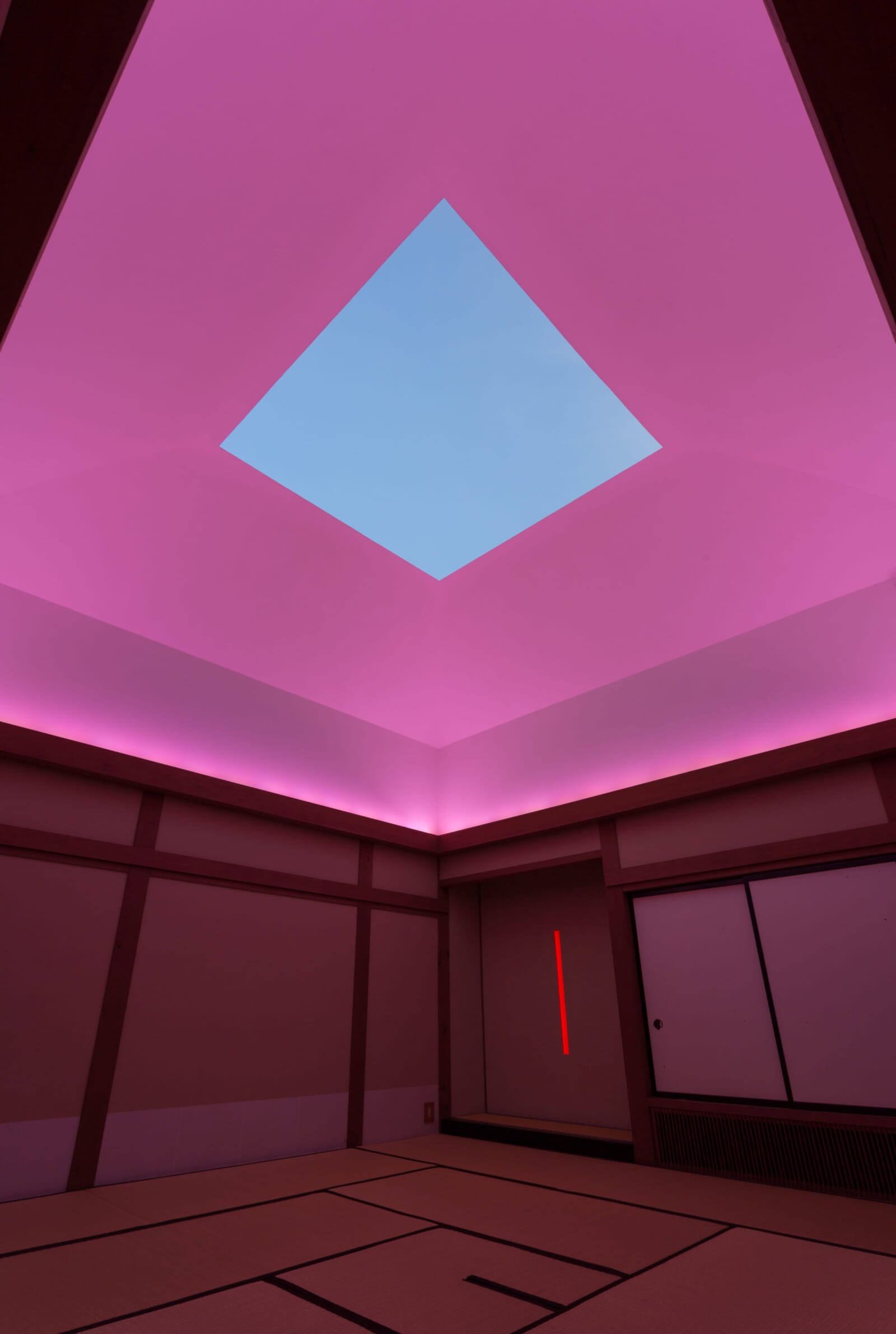 The house is both an artwork and an accommodation. It has three bedrooms, a spacious bath and one large room that houses the main installation: a striking, square-shaped hole in the roof, covered by a sliding panel that can be opened manually. At sunrise and sunset, this aperture becomes the center of a spectacular 40-minute program — the ceiling around it lights up in a series of subtly shifting colors, harmonizing with the natural hues of the sky. Guests are encouraged to lie down on the tatami floor and look up, marveling at the interplay of light, space and atmosphere.