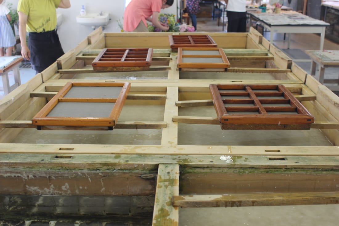 For visitors to QRAUD Tosawashi Kougeimura, a craft village in the central Tosa paper making town of Ino, the papermaking process is simple. First collect and drain the papermaking material, then create a design on the paper while still wet using fresh flowers and plants, then wait for it to dry. Simple!
