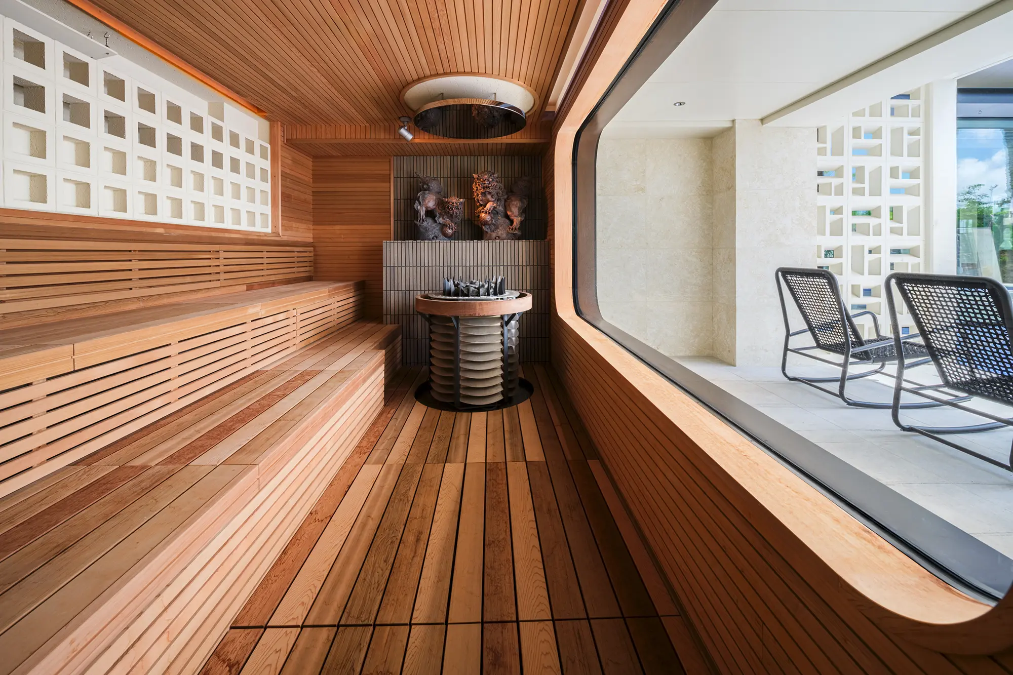 In terms of amenities, Seven x Seven Ishigaki also boasts saunas and cold baths with beautiful design flourishes. One of the highlights is unquestionably its authentic Finnish sauna, where you can experience löyly — the hot steam that rises from a sauna stove when water is poured on the hot stones — directly from the mouth of a shisa, a mythological lion-dog statue with great significance in Okinawan culture.