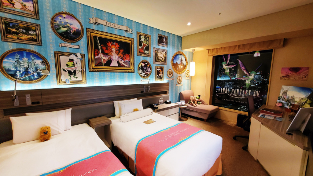 The lone room, bursting forth in its ecstasy of colors and Final Fantasy XIV-inspired artwork and memorabilia, is a fantastical outlier in an otherwise classy business hotel. Though it hasn’t been gutted to remove all traces of its default condition as a twin suite with towering city views, incredible attention to detail has been applied in recreating the essence of Square Enix’s world.