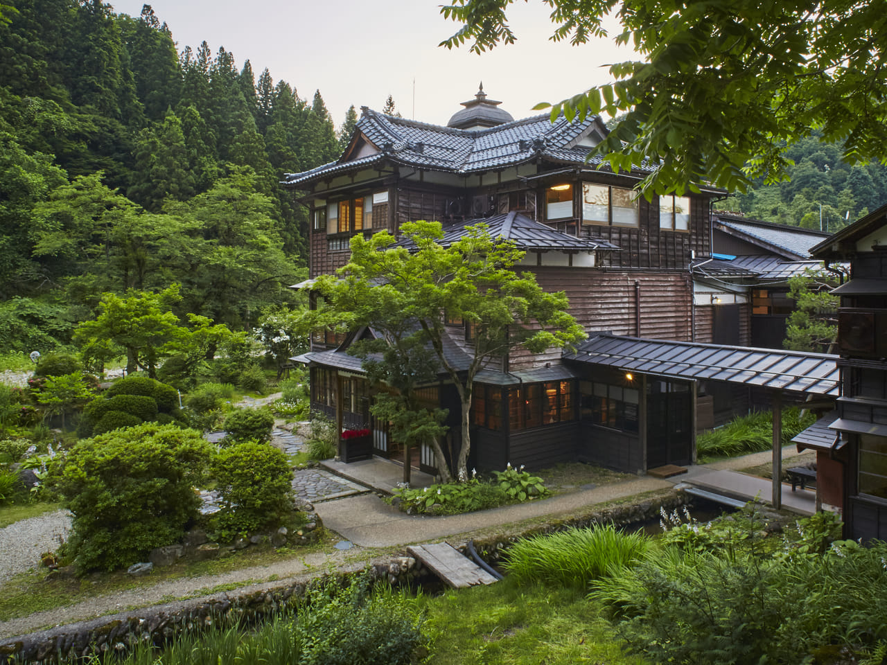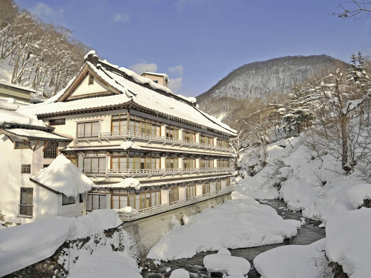 Situated an hour from the nearest train station (there’s a free shuttle bus once a day from Tsubame-Sanjo Station), this historic ryokan sits at the edge of Shinano River, far away from any other houses or inns. Feast on a lavish bounty from the nearby mountains and follow up with a soak in one of the two open-air baths that can be reserved privately. Guests are also welcome to order a traditional sake set, which floats in the bath as you enjoy your dip. In the lobby, you can drink straight from the ryokan’s pure, natural hot spring.