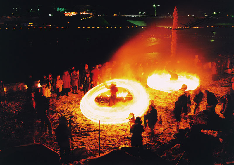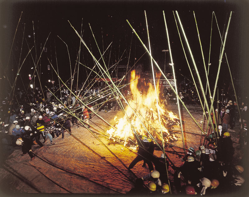 Not far away, in Rokugo, Misato, the festival of Takeuchi takes the competition to an even more intense level. The stakes in this competition are the same as the tug-of-war—a win-win situation—but the competition is handled by teams of men carrying six-meter-long bamboo poles. The teams fight three rounds to see which group can drive the other across the field of play. For the final skirmish, poles are lit in a ceremonial fire. Finally, when the fiery battle in the snow comes to an end, hands are shaken, and communal ties are restored over laughter and sake.