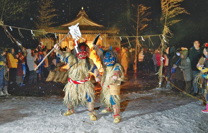 While you can find namahage masks and statues throughout the length and breadth of the prefecture, the origin of this folkloric figure lies on the western coast of Akita, and the Oga Peninsula. A rocky, axe-shaped outcropping that protrudes into the Japan Sea, this region is known for its rugged, attractive coastlines, fresh and delicious seafood, and the namahage. The most impressive time to see namahage “in the flesh” is at the Namahage Sedo Festival in Oga City.