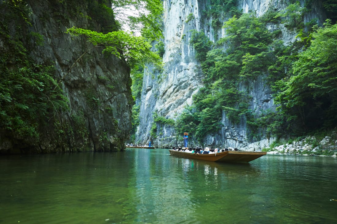 Geibikei, also known as Geibi Gorge, has been a popular tourist destination for over 100 years. Boatmen steer long wooden boats through the shallow waters of the gorge, explaining natural rock formations on both sides of the two-kilometer stretch of soaring limestone walls of this natural monument. The boat stops at one end and lets everyone off so they can stretch their legs and try their luck at Daigeibi-gan, a giant cliff nearby. Visitors can buy clay balls (called undama) with kanji character inscriptions symbolizing good luck, health, or love and hurl them at a hole in the cliff. Should your clay ball enter the hole, your wish is likely to come true. Once you’ve boarded again, the boatmen will serenade you with a song called “Geibi Oiwake”, as they guide you back to the boat center.