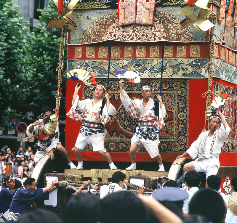 Collectively known as the yamahoko, these floats display a level of craftsmanship that is unparalleled for festival arts in Japan, earning them a place among UNESCO’s Representative List of the Intangible Cultural Heritage of Humanity. The yamahoko started to develop into impressive structures during the Medieval Period, but it was the wealth of the Edo Period merchants who lived in the area that transformed these floats into the giant vessels that navigate their course through the streets of Gion today. Accompanied by dozens of attendants, the yamahoko are impressive to behold, standing a total height of 6 to 8 meters above the crowds that gather for the procession, with wheels that roll nearly 2 meters high.