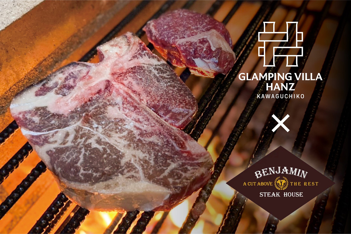 Glamping Villa Hanz runs a collaboration with Benjamin Steak House. Initially established in New York in 2006, the Benjamin Steak House brand migrated east, with restaurants in Tokyo’s Kioicho and Roppongi neighborhoods, and another in Kyoto. Here, customers can enjoy USDA-approved beef in the form of a dry-aged T-bone (Porterhouse) or tenderloin steak paired with their pick from a selection of 400 wines.