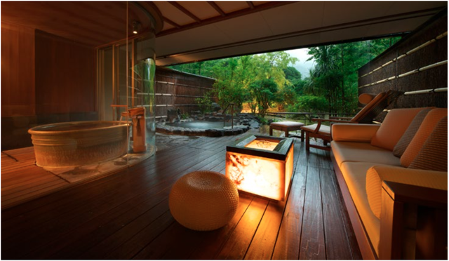 Inspired by its natural surroundings, Ginyu’s varied room styles take their names from the elements: Kaze (Wind), Hoshi (Star), Sora (Sky), and Tsuki (Moon). Starting from the fifth floor, where reception and the main lounge area are located, you can go down one floor to the Kaze rooms, which provide remarkable views down into the Haya River valley. The Hoshi rooms, on the third floor, are decorated with an exotic, Balinese-style theme, while the bright, airy feeling of the Sora rooms is complemented with traditional Japanese décor. Finally, the first-floor Tsuki rooms face directly onto the ryokan’s traditional Japanese garden.