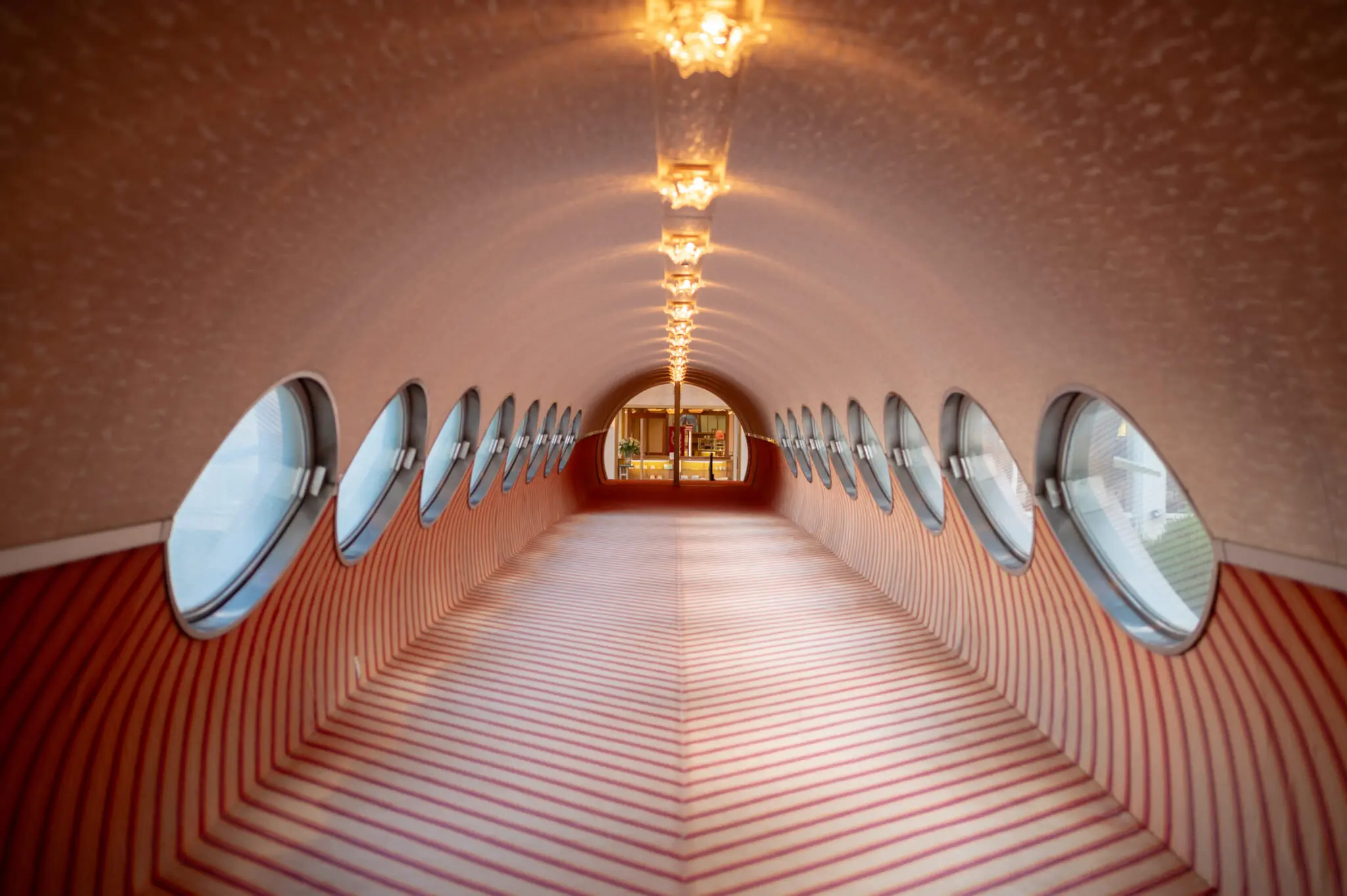 In many ways, the hotel embodies the optimistic architectural visions of the Showa era (1926–89), when the future was an unknown and exciting place. At the time Hatoya was built, Japan was experiencing unprecedented transformation and economic affluence, and this was reflected in its bold and futuristic design choices. Stepping into the spaceship-esque tunnel feels like the boundary between here and there. The first time, my skin prickled, and I felt strangely emotional as the edges of reality softened around me.