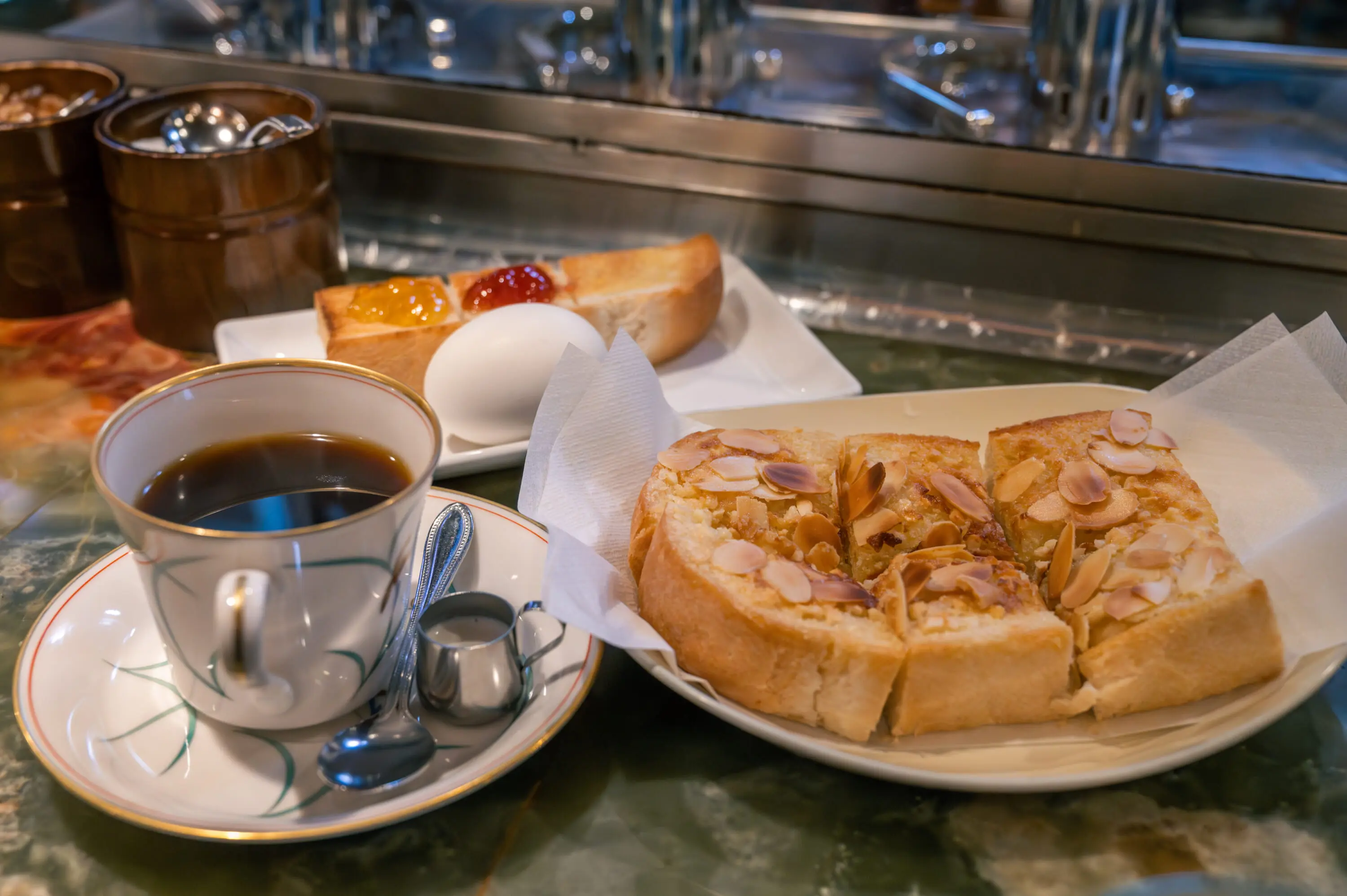 From 7am to 11am, the shop offers a breakfast service, a kissaten custom where customers receive a free breakfast with any coffee order. Make sure to try the almond toast, too, a Himeji specialty served throughout the day. At Hamamoto Coffee, it’s made with a delicious trio of almond powder, diced almonds and sliced almonds set atop a portion of pillowy-soft shokupan bread.