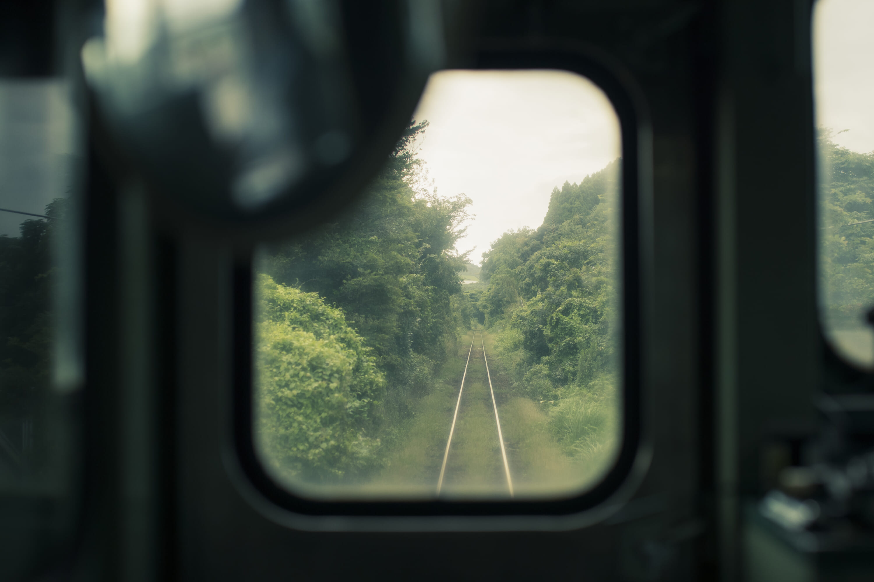 Much depends on the train, the season and the scenery. Fukushima might fill the frame with the Yufuin-no-Mori’s bulbous front car exiting a bamboo forest – green against green – or the Kyushu Shinkansen barreling through the year’s first snowfall. But he’s just as likely to focus on the backdrop of the journey. He shot the mustard-colored Aru Ressha train, as a small, distant object, beyond a big, bright yellow blur of spring wildflowers. He showed the coastal Omura Line’s two-car train off to one side, rounding a bend above the ocean in the fading light of dusk. His images taken from inside of trains depict the everyday of students commuting to school, interior details of artisanal kumiko woodwork and glimpses of rice fields and mountains through blurred window frames.