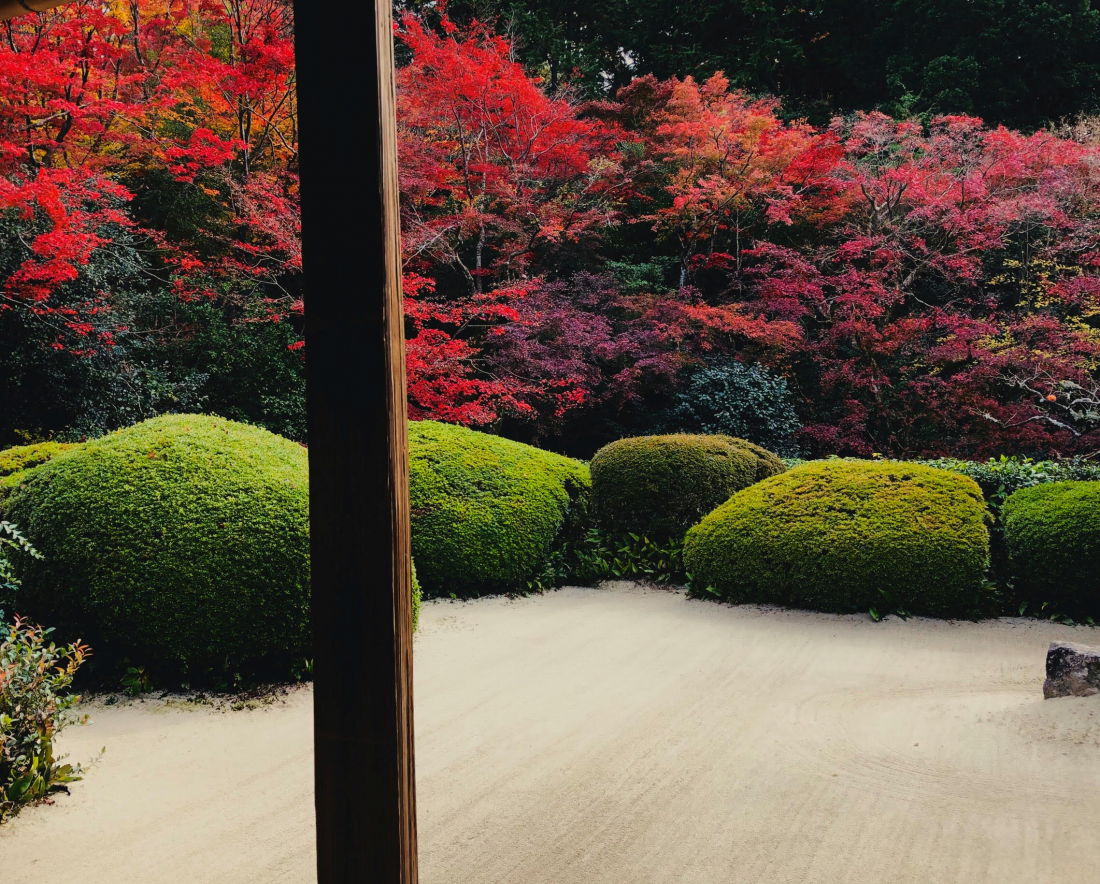 The garden of Shisendo specifically arranges its autumn leaves against the sea of white sand so that a superb contrast is created for the crimson red to stand out at its best.