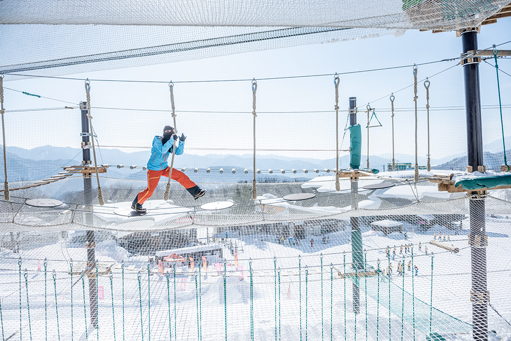 For older kids, Tsugaike Kogen offers several more adventurous activities. Take the gondola to the middle station and find fire pits surrounded by fat tire bikes, sleds, snow tubes and more. They can also climb through hoops and scamper over rope bridges at the towering net course.