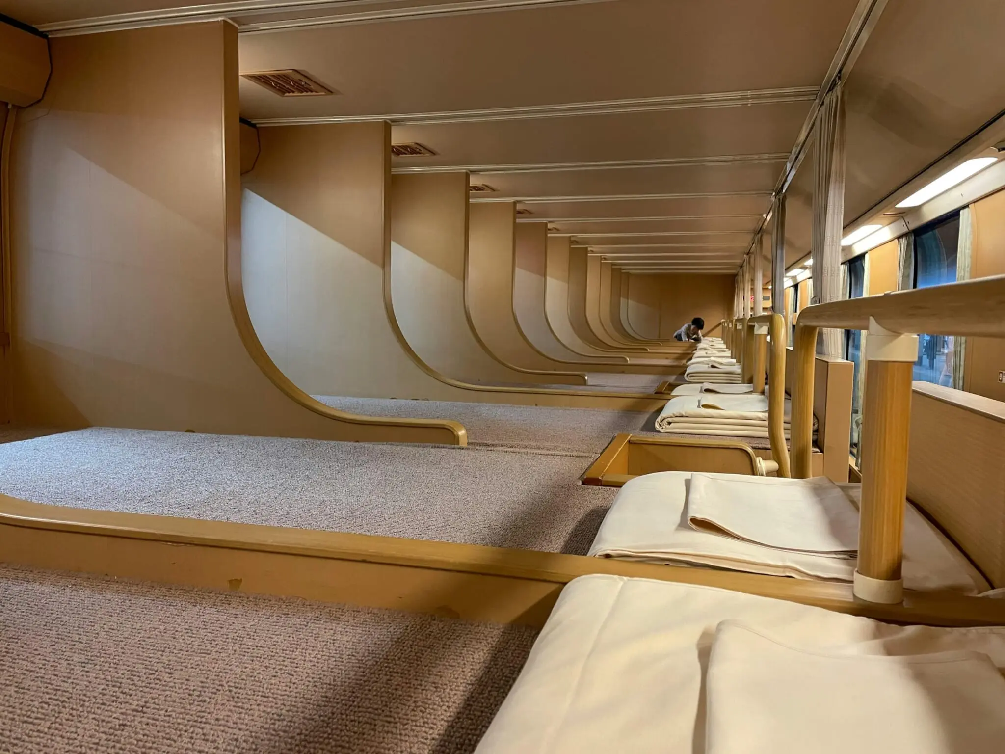 The Sunrise Express has various accommodation options for different budgets and preferences. The standard Nobinobi Zaseki beds are the cheapest and are semi-private carpeted bunks. The private rooms are more expensive but allow for more comfort, with bigger spaces, softer beds, luggage storage and a separate closed bedroom. These private rooms range in size. There’s also a deluxe room equipped with a bed, desk and a sink.