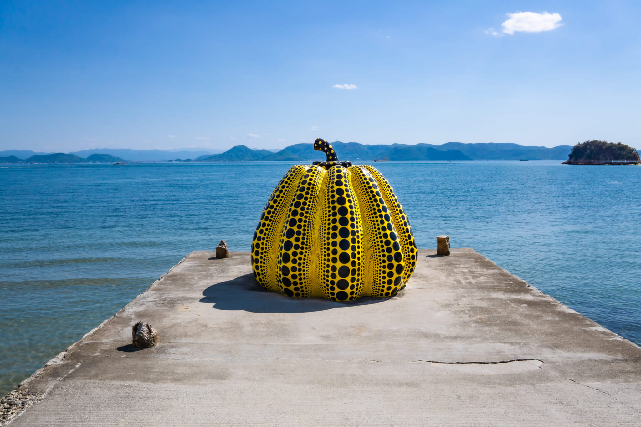 Naoshima, Japan: Pumpkin Art by Yayoi Kusama. Photographed during a sunny day on Naoshima Island, Japan.