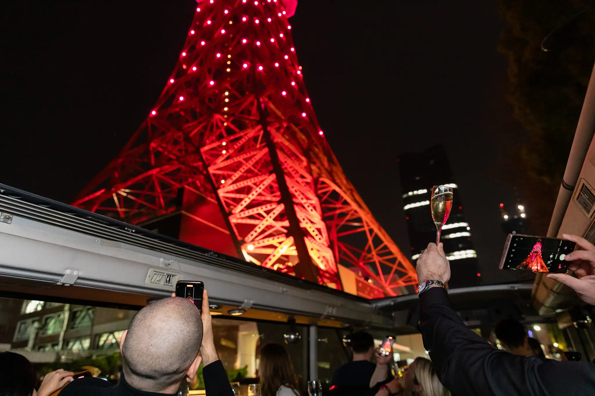 With excitement building, the bus engine starts and you soon reach Tokyo Tower. A clear ceiling allows for spectacular night views of the 333-meter-high landmark, but on clear evenings, a staff member opens the top of the bus for a full sensory experience.