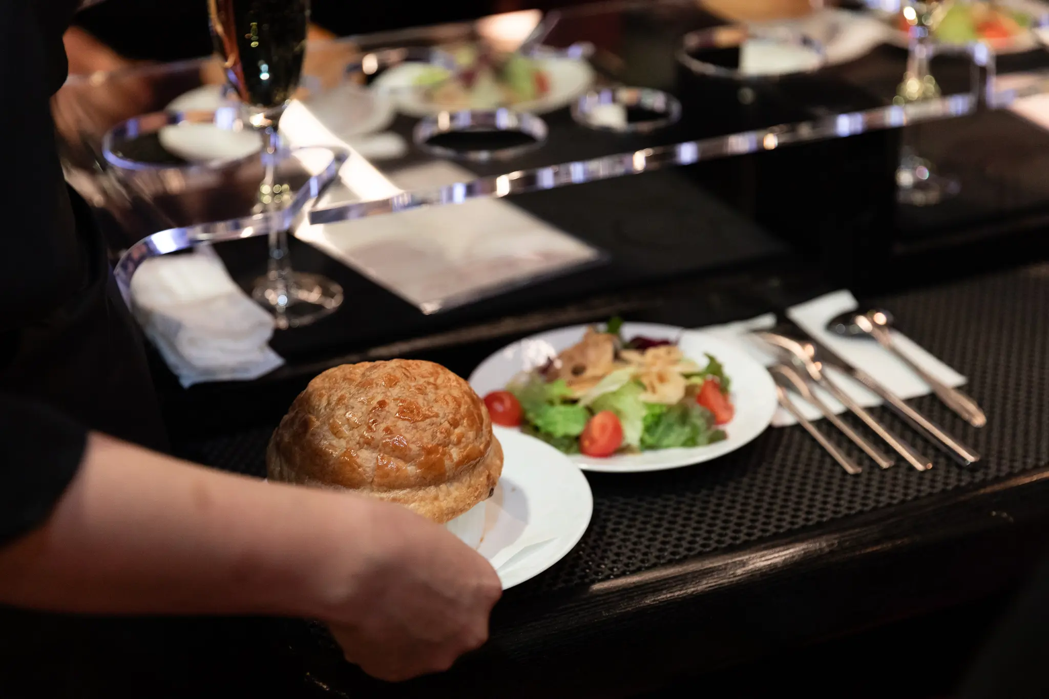 The French course starts with a variety of appetizers — including some sea bream carpaccio and baked egg potatoes — a salad and a delicious piping hot clam chowder pot pie before moving on to mouth-watering mussels provencal. The main course is roast beef fillet before ending the feast with a sweet dessert.