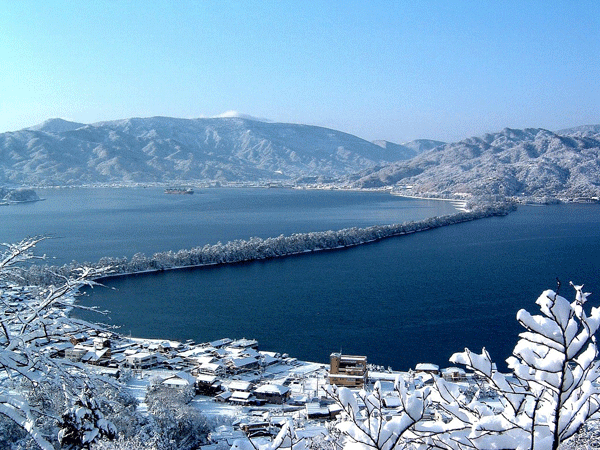 The bridge of heaven, Amanohashidate (pictured above) is the two-mile sand bar that straddles mountains, separating the Miatsu bay, on the Japan Sea, from the Asoumi lagoon. According to legend, a ladder, named Amanoukikashi, was placed so that the male God, Izanagi, could go back and forth between the heavens and the beach of Kushibi, where he liked to live. He was, though, a careless god and fell asleep, the ladder crashing to earth and forming the bar we can see today.