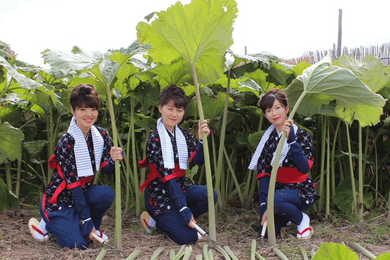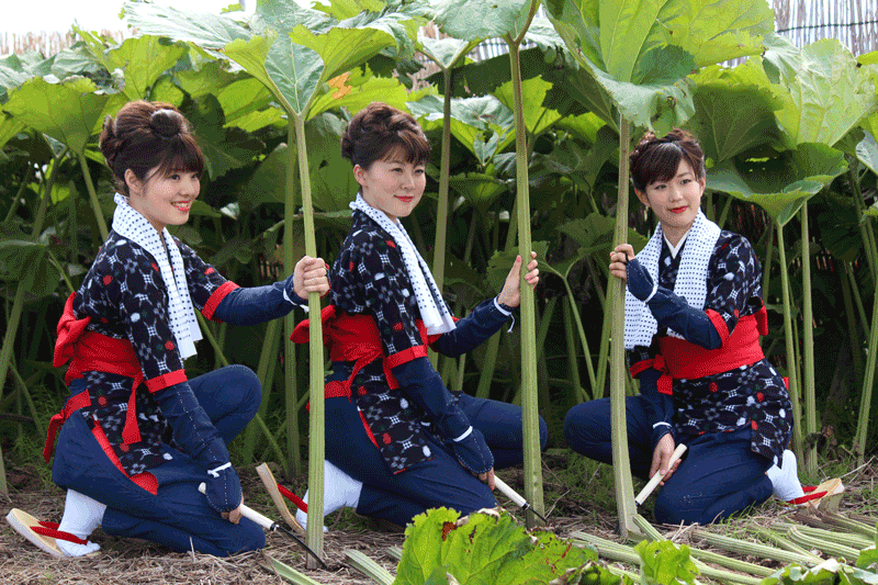 The Akita Obako frequently appears in traditional farming clothes: a dark blue coat and pants, which are marked with colorful, geometric patterns. The outfit is set off with a thick red belt and shoulder straps, which would have been a kind of simple backpack years before, and topped with a red ribbon in the hair. In a case of life imitating art, most of the time that people are dressing as the Akita Obako, they dress in the same style as the manga “original,” sometimes adding a pair of red cloth gloves. In photographs, she is often next to the thick-stalked, broad-leaved fuki. A type of butterbur that is also known as Japanese sweet coltsfoot, the fuki is Akita’s official plant. This wild-growing green can quickly grow to impressive heights and is known for its tangy, bitter taste.