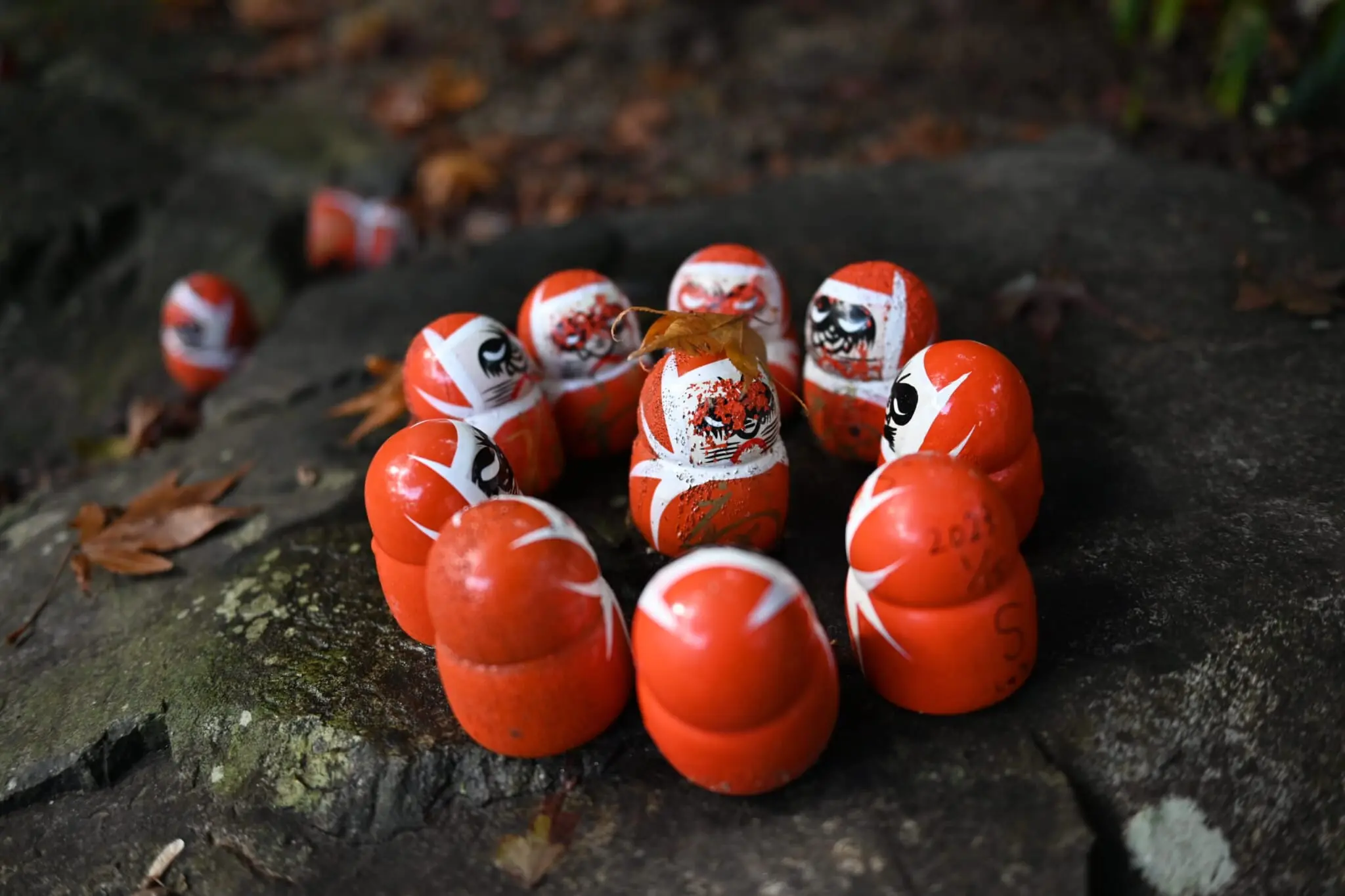 Daruma dolls of many sizes adorn every nook and cranny of the temple grounds, and seeing how many you can spot is a fun activity in and of itself. These kachi-daruma, or “winning daruma,” are unique to Katsuo-ji and have the kanji character for “win” on their bellies.