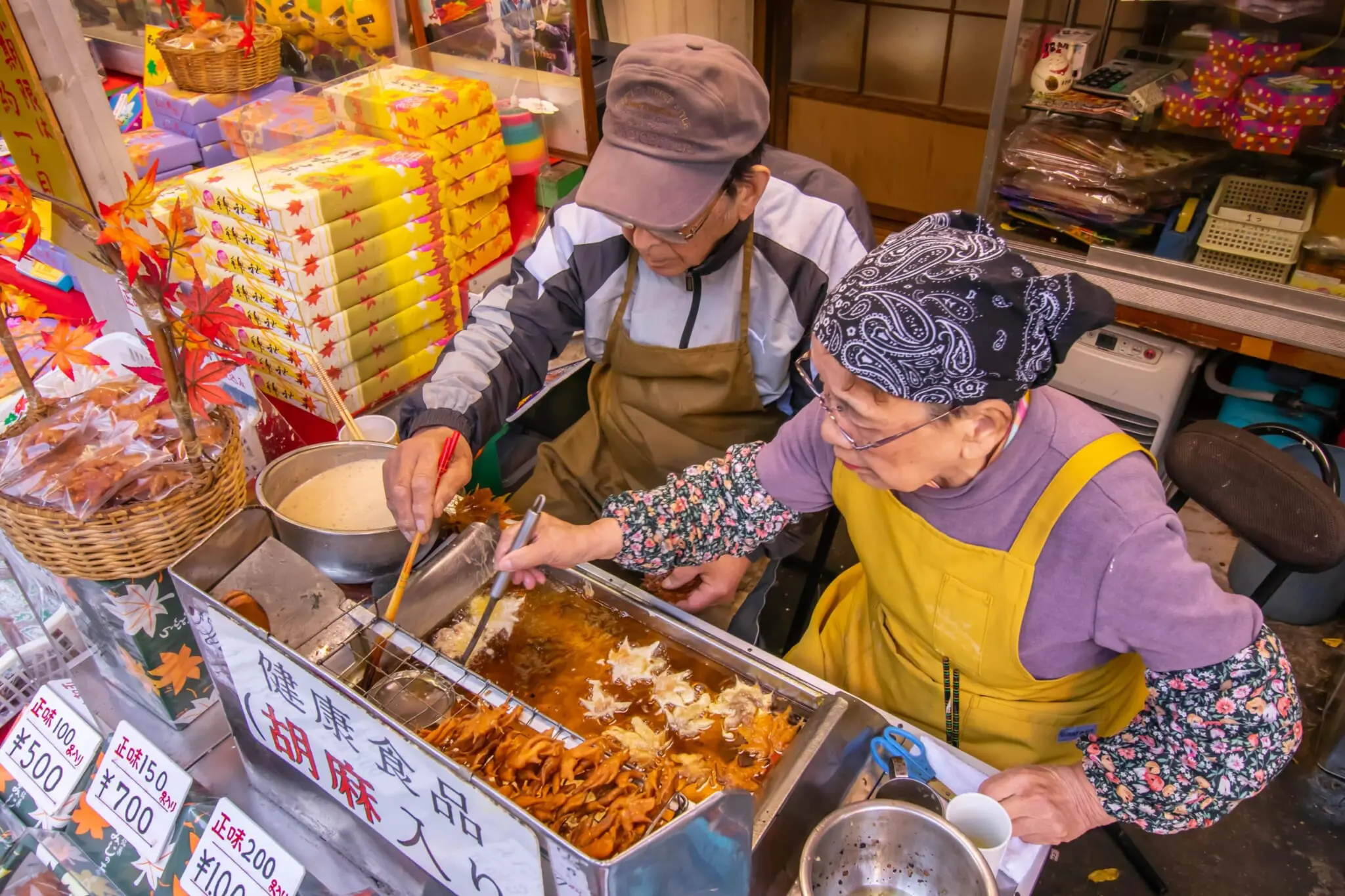 These sweets, made with the autumn yellow leaves of the ichigyoji maple, take more than a year to prepare in a process that involves harvesting the leaves, preserving them in salt, hand-selecting undamaged leaves and, finally, frying the leaves and flavoring them. One of the most famous shops is Hisakunikosendo, located right in front of the station exit.
