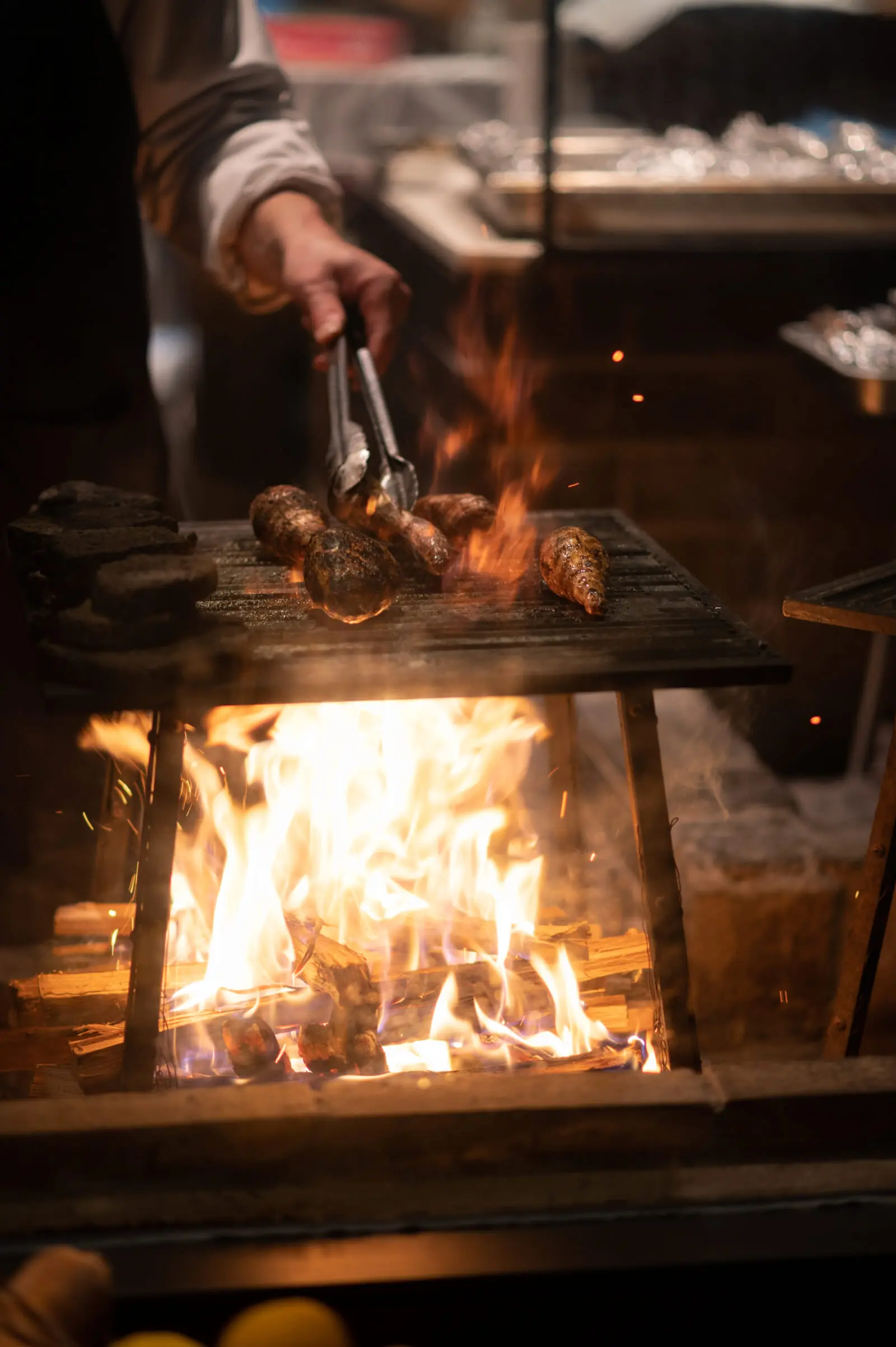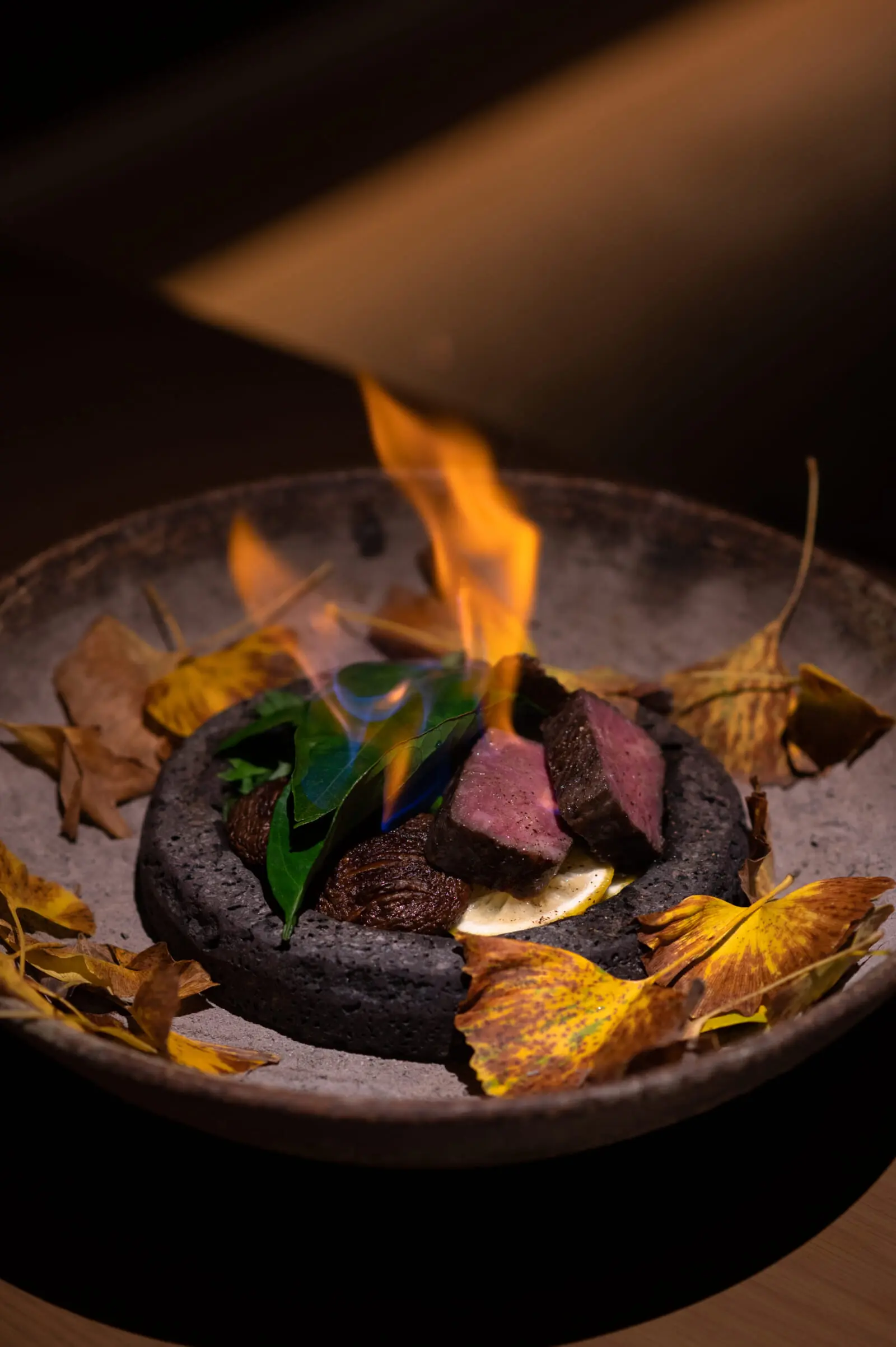 FUFU Kawaguchiko’s restaurant, Yamanoha, is decorated with wood and fire accents, radiating warmth as soon as you step in. Walking right in, guests can see ingredients roasting away over an open fire. You know you’re in for a treat. The multi-course meal feels like the best parts of camping are distilled into a relaxed gourmet experience — plates are decorated with leaves and branches. The meat is cooked with firewood and on lava stones, becoming tender, smoky and delicious.