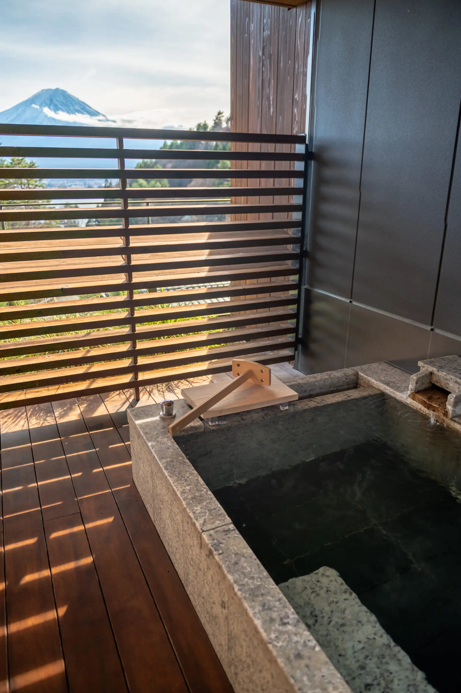 Every room has a view of Mount Fuji. It’s only natural that the Japanese icon inspired the decor. Of note are the volcanic rocks sprinkled with essential oils placed under bell jars that act as dispensers for an original FUFU fragrance. The outdoor private hot spring bath the made from volcanic stone said to have a high infrared effect, gently warming you to the core. The same material is used to line the sauna in the two most luxurious suites.
