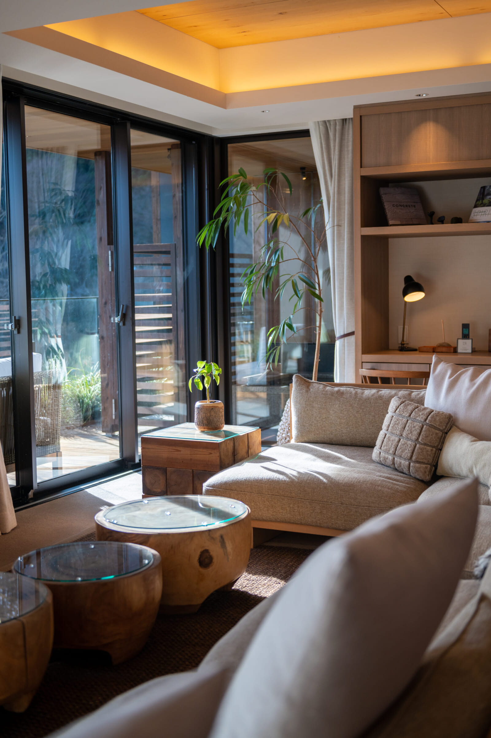 Those who prefer to stay indoors can still enjoy the lush surroundings. FUFU Kawaguchiko strives to create borderless nature, starting in the lobby, which is home to its own small green forest. Plants thrive among natural decor — wooden tables, wicker baskets, rugged stone ornaments and cozy sofas. Hidden nooks are divided by tall stacks of firewood so guests can enjoy sharing the shared space without sacrificing privacy.