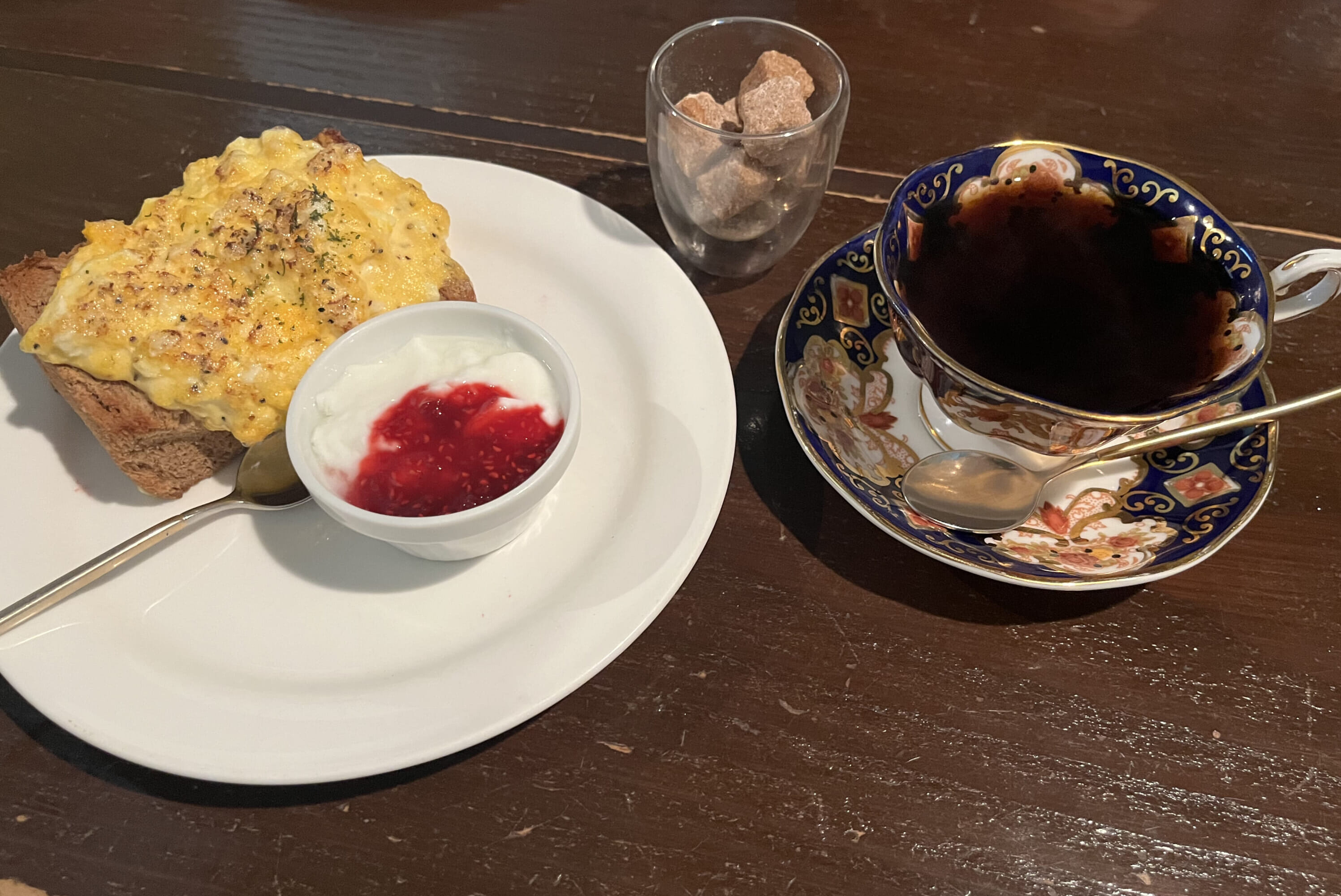 All drinks come at a flat rate of ¥500 on the morning menu. For the free breakfast, customers have two options. The egg toast breakfast plate consists of a 3-centimeter-thick slice of toast covered with an overflowing layer of crushed egg paste mixed with mayonnaise and a small cup full of fresh plain yogurt and homemade fruit jam. The second option is the black sesame and black sugar toast breakfast plate. It comes with two cute little cups, one filled with crushed egg salad, and another filled with fruit jam.