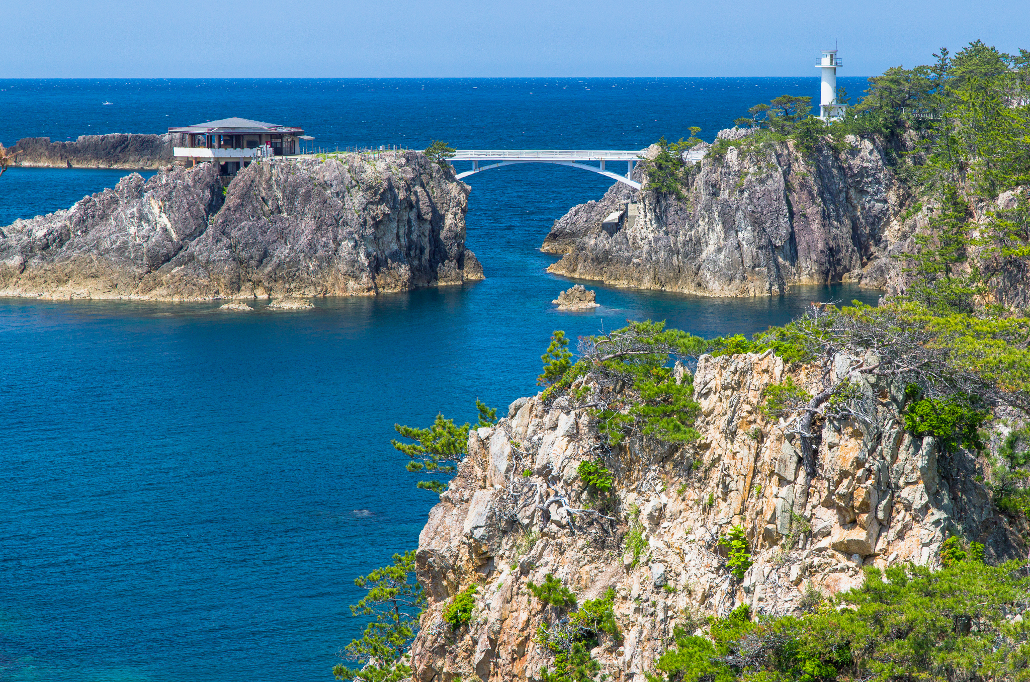 Farther along the coast, Shikisai Kappo Den, run by a husband-and-wife team, works to the same principles. Their sashimi is fresh and meticulously prepared, and can be ordered alongside small-batch sake. On the edge of Mano Bay, Nagahamaso Uodojo runs as both inn and working kitchen. Tanks hold the day’s catch just behind the dining room. The owner, a sushi chef with more than 40 years’ experience, pulls fish directly from the water to his board.