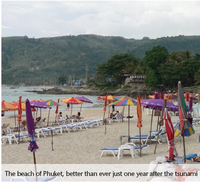 Helen Bottomley visited Phuket one year and one month after the tsunami. Upon entering Thailand, a tour guide told her that “Phuket had been through the washing machine” and had come out better-and cleaner- than ever, thanks to her country’s generous donations. Indeed, formerly dingy hotels had been entirely rebuilt, facilities improved and everything from beach chairs to umbrellas were brand-new and beautiful. According to Bottomley, the main tourist road by the beach had been perfectly cleared, and tourism numbers seemed healthy, as her plane was full of tourists and the tickets had once again been hard to come by.