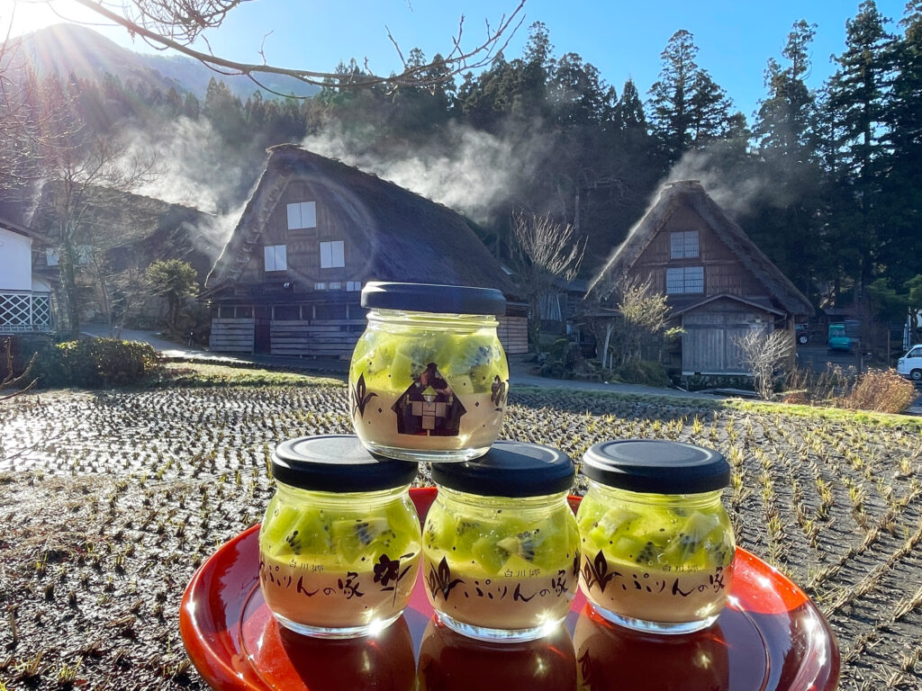 It should come as no surprise that Purin no Ie (house of pudding) specializes in pudding. The shop, established by residents with long ancestral ties to Shirakawa-go, prides itself on its use of high-quality ingredients, like Hida melons, Gifu-developed Minomusume strawberries and pristine local spring water. Purin no Ie’s smooth-as-silk nameraka pudding and its award-winning mizu (water) pudding attract visitors from all over Japan. A variety of other standard, seasonal and village-inspired puddings are also on offer, like gohei mochi pudding with a miso aroma, Shirakawa matcha pudding made with matcha from south-central Gifu’s tea-producing town of Shirakawa and strawberry pudding.