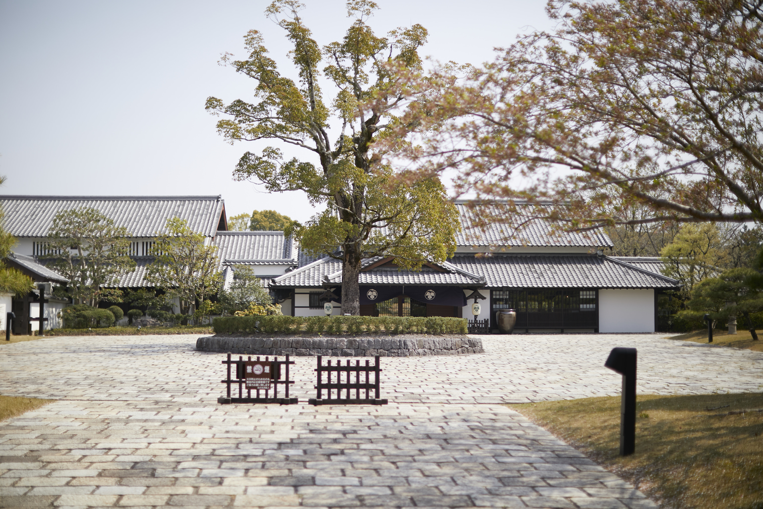 To reach the very grand entrance to Katsuragi Kitanomaru, we first had the pleasure of driving up a long winding road offering expansive views over the city and rolling mountains in the distance. In springtime, the road is gloriously lined with pink cherry blossoms. As the free shuttle bus, which had collected us from Kakegawa Station, slowed down to pass through the main gates, the first thing to attract our attention was the Kakusho-mon Gate. Surrounded by a moat, this impressive structure is modeled on the “old samurai residence gate” of an Edo-era local governor’s house that still stands in Kikugawa city. The paving stones leading up to the gate were once used for streetcar tracks, and the tsuji-andon (outdoor lantern) is made from an Edo-era paper shade.