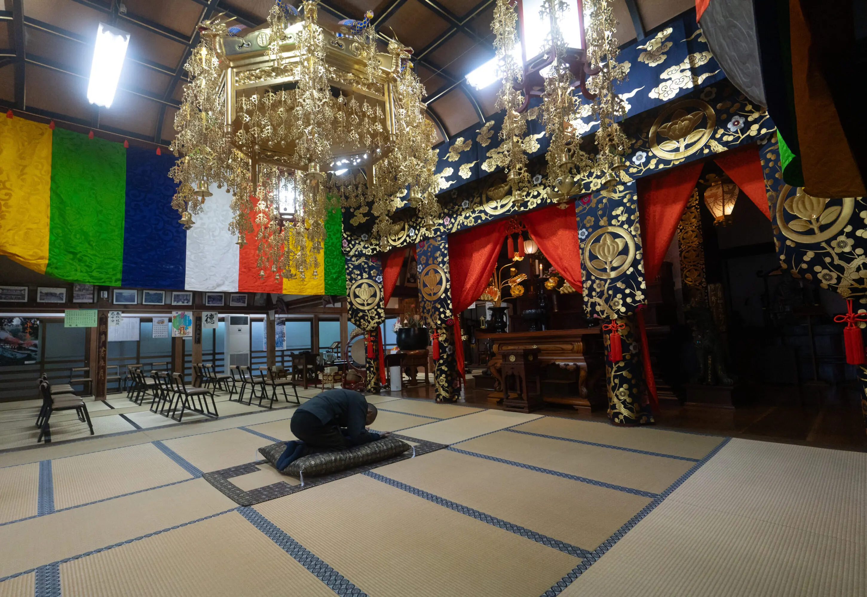 After morning Zen meditation, prayers occur in the main hall. Head monk Sogen recites prayers as chants to the main deity enshrined at the temple, the thousand-armed, thousand-eyed Kanzeon Bodhisattva.