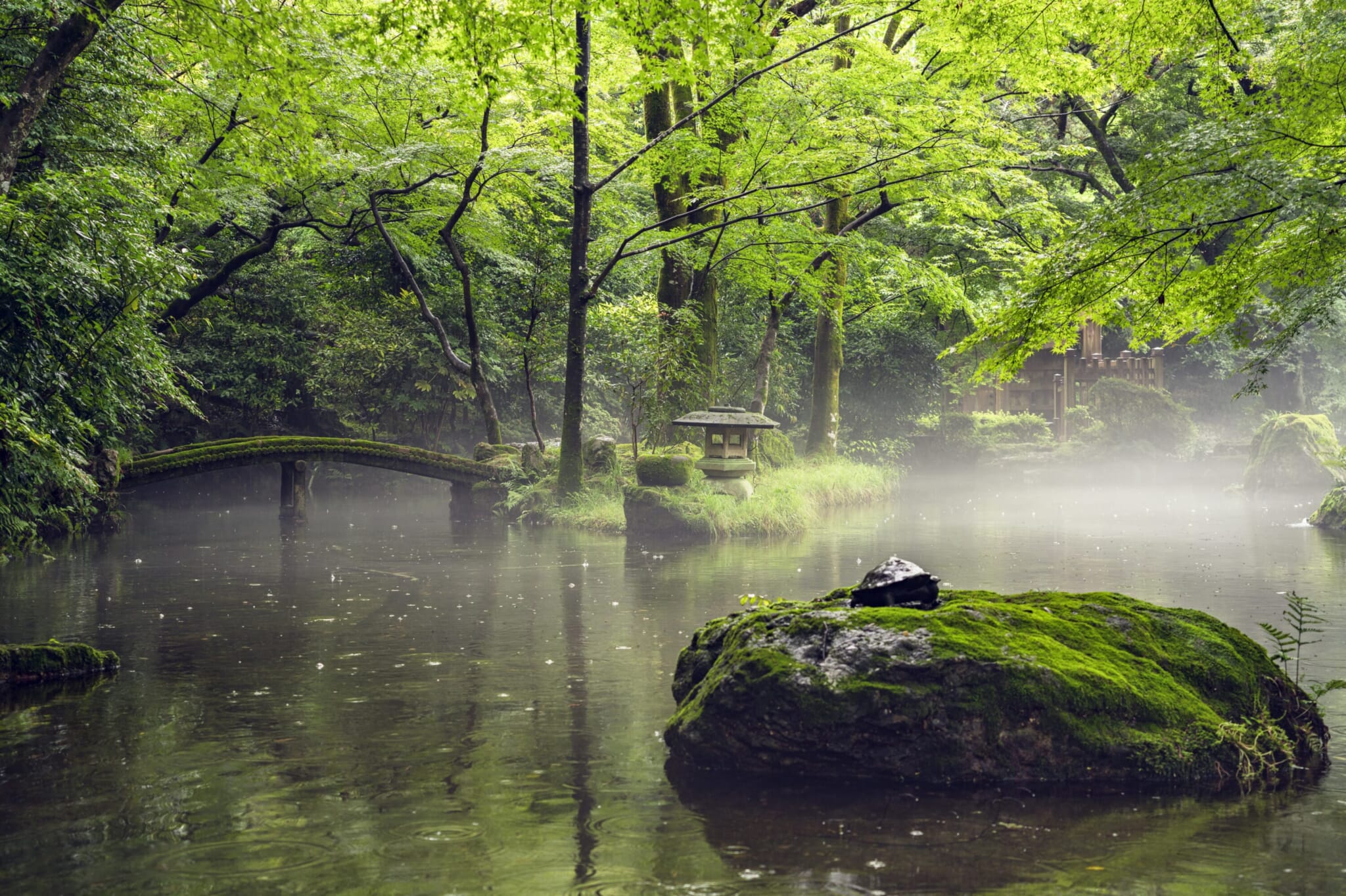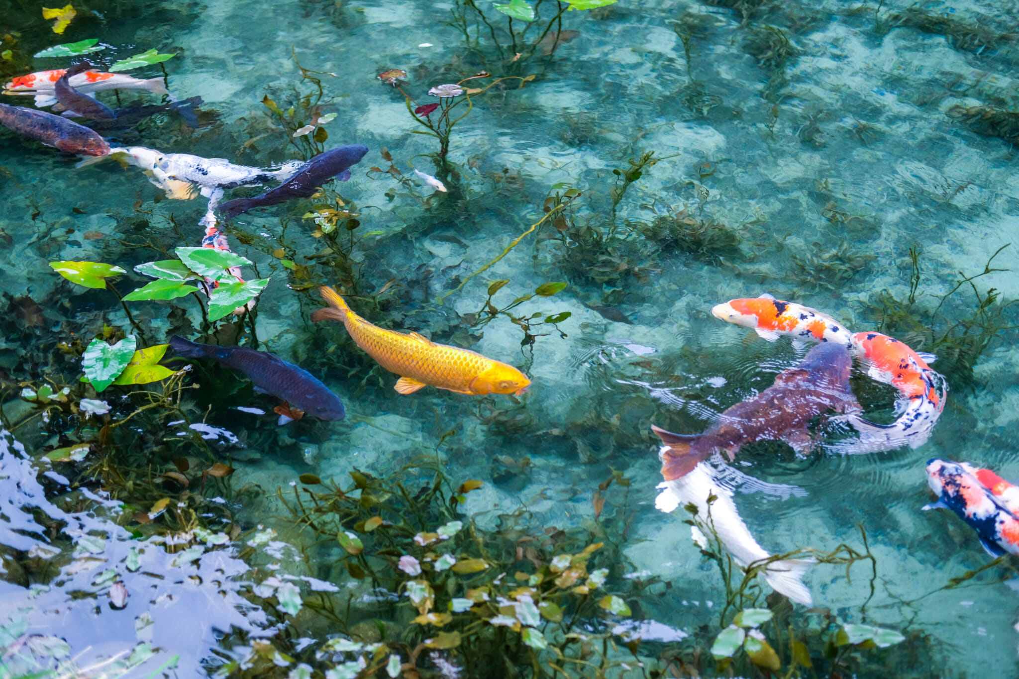 Located next to Nemichi Shrine, this picturesque pond features crystal-clear turquoise water dotted with lily pads, which bloom in early summer, and colorful koi. In late autumn, the surrounding Japanese maples brighten up the landscape with their fiery hues.