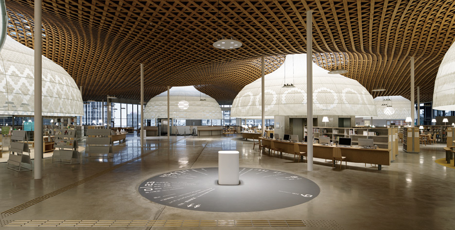 Check out the second-floor library for a stunning “forest of umbrellas”: Eleven large-scale half-globes made of triaxial woven fabric, each with its own pattern, hang from the library’s undulating ceiling, casting a soft glow over the space. The library’s unique design is at once futuristic yet organic, minimalistic yet whimsical, making it a must-visit location. The facility even has its own Minna no Mori typeface, used throughout the building, for Japanese, English and numerals.