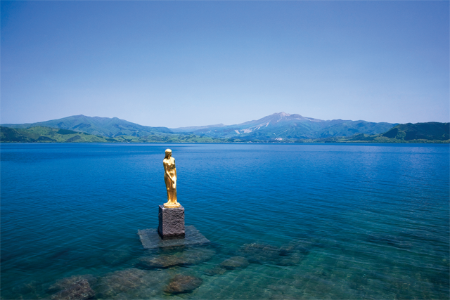 The city of Kakunodate is just one of the appealing features of Akita’s Senboku region. To the north lies the area around Lake Tazawa. In addition to being Japan’s deepest lake, Tazawa is also the source of one of the region’s more colorful legends. As the story goes, Tatsuko Hime was a beautiful girl who lived close to the lake. She believed that its waters would make her even more lovely, and so she drank far more than her fill of them—so much, in fact, that the gods took offense at her greed and vanity. They transformed her into a water dragon and charged her with the grim responsibility of guarding the lake for the rest of time. Her tale has been given golden tribute in the form of a statue that sits off Tazawa’s southwest shore.