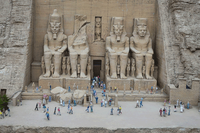 The park is divided by zones, highlighting sites in modern and ancient Japan, Europe, America and Egypt. Train arrivals and departures are announced in a miniature version of Tokyo Station. In Europe, Barcelona’s Sagrada Familia is surrounded by construction cranes, incomplete, just as in real life. In the US, the Twin Towers of the World Trade Center remain standing in tribute. Taiwan’s Taipei 101 skyscraper is the most recent addition to the park’s Asian zone. The Great Temple of Abu Simbel is crawling with tiny tourists.