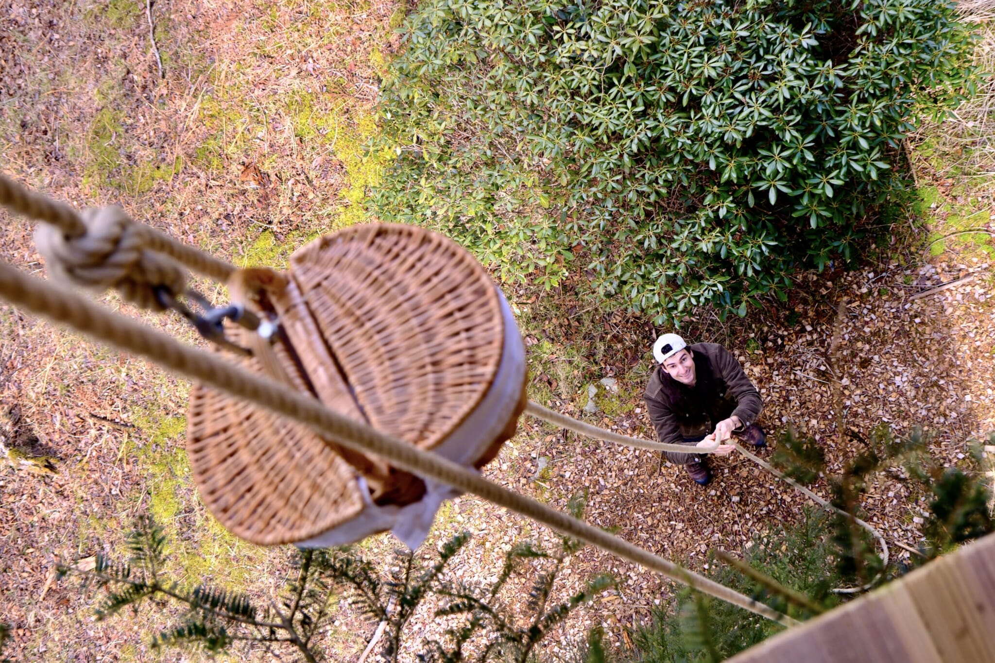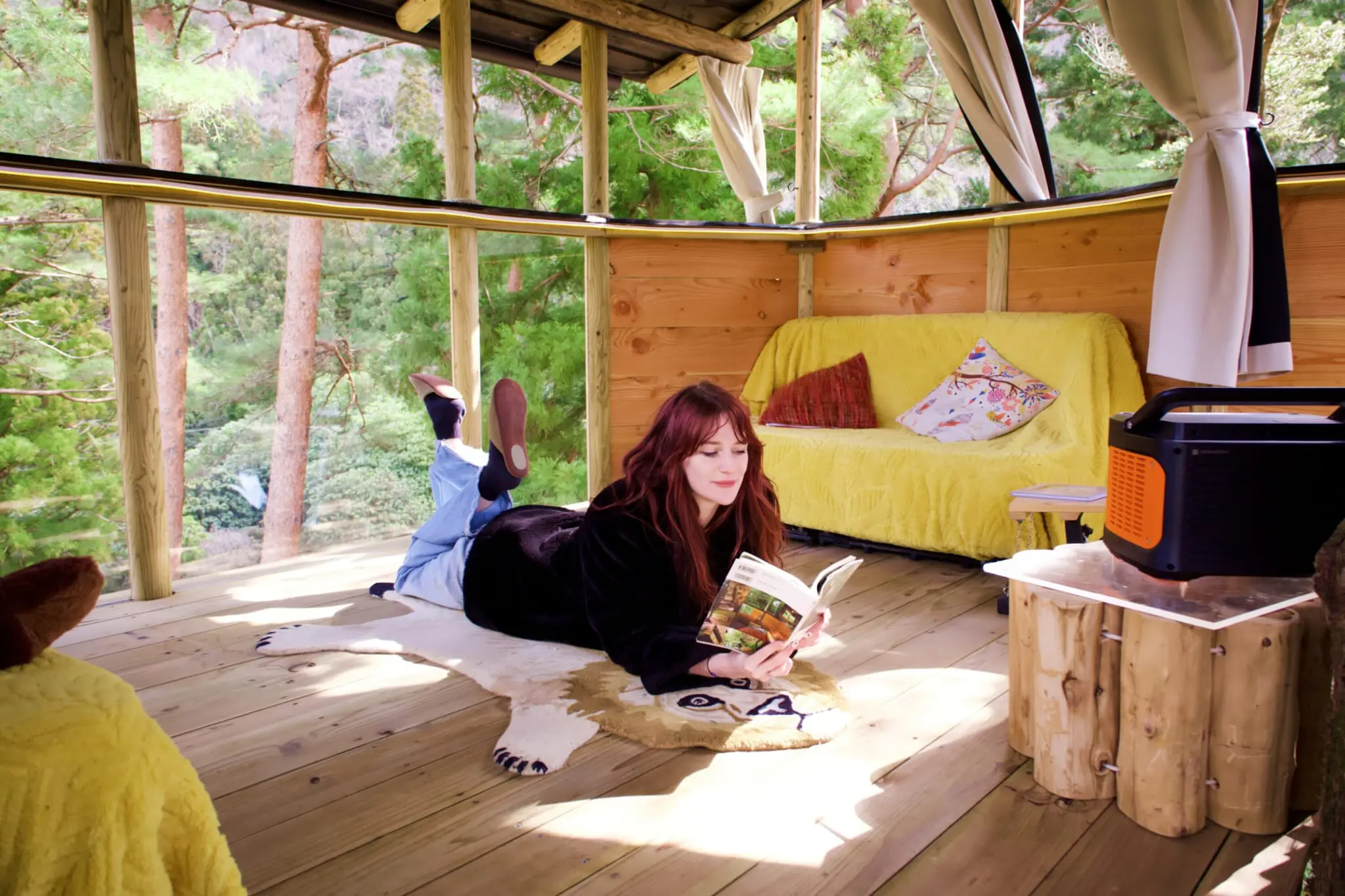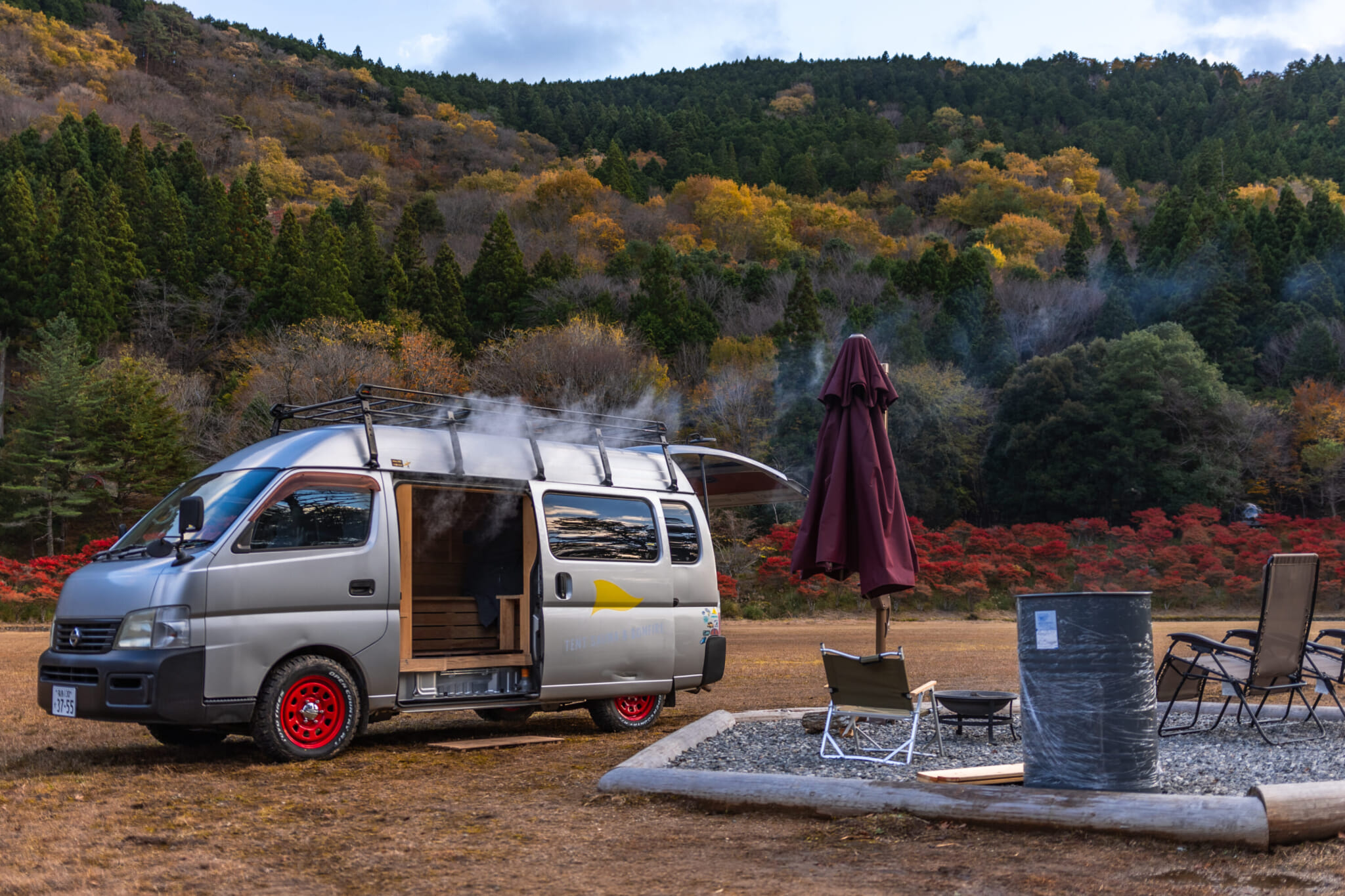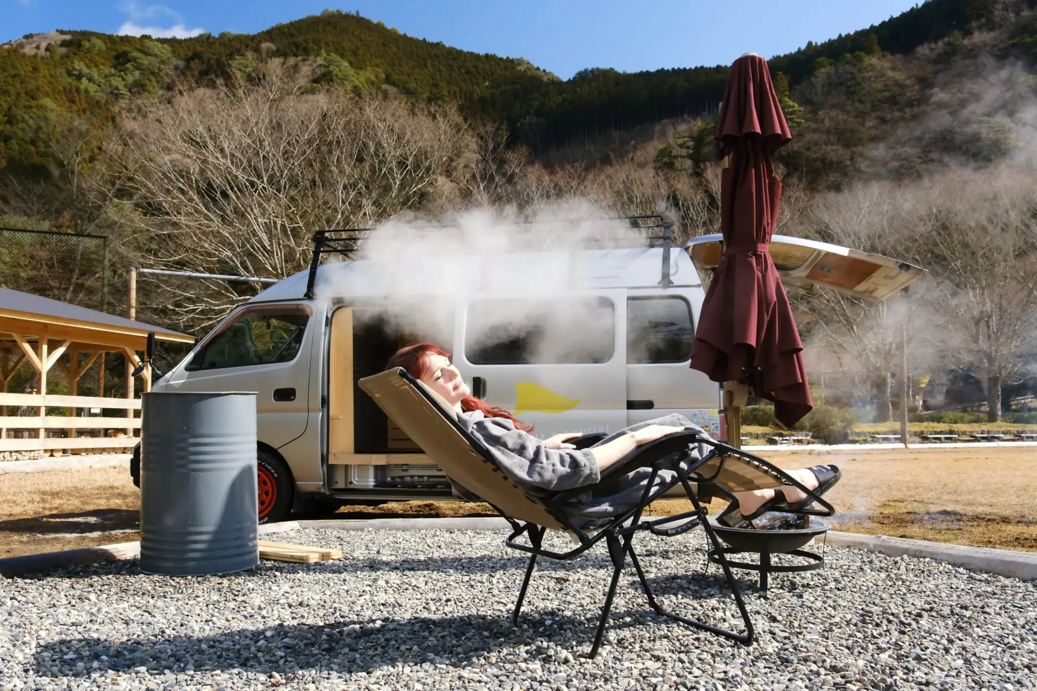 In addition to day visits, the park offers treehouse glamping trips and recently added a sauna experience inside a van parked in a field beside the park entrance. Though the exterior is rather nondescript, the inside feels like a high-end spa, with stylish wooden details and a soothing, smoky aroma. Upon exiting, guests can take a cold plunge and then relax fireside while admiring the mountain scenery.