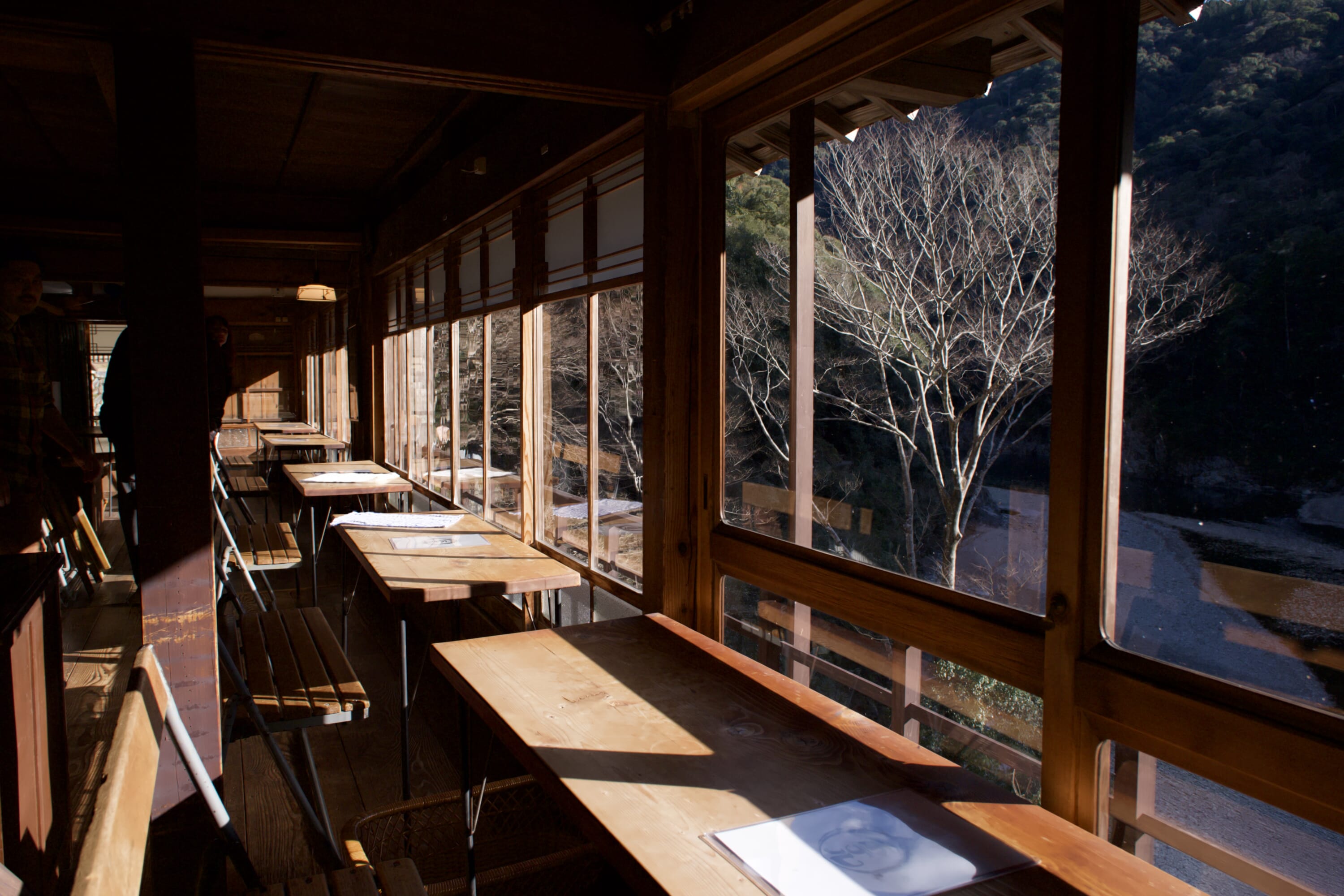The women’s bath on the second floor has no path to the river for privacy reasons, but it boasts unique charms too. Resembling a mythical grotto, it has a massive communal onsen of its own. A large aperture in the stone wall looks directly into the dense forest of Japanese cedar on the opposite bank. You can easily lose track of time gazing at the trees, watching the thin cloud of steam billowing from the men’s bath below along with bursts of laughter and relaxed pleasantries from the customers there.