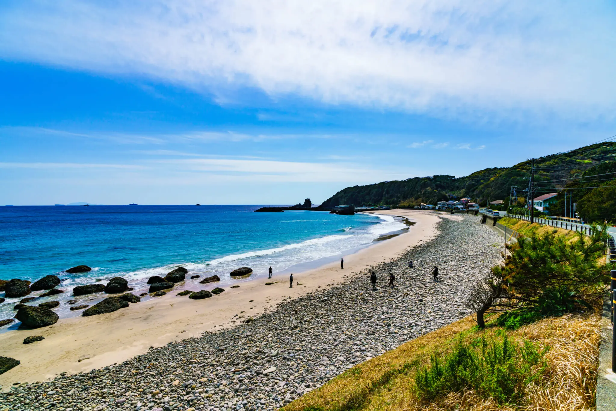 At nearly 1km long, Imaihama Beach in Izu, Shizuoka, is one of the longest beaches on this list. It also opens the earliest, with lifeguards starting at 8:30am during peak season. With its clear, shallow waters, it’s fun for all the family. It’s easy to access too as it’s just a 10-15-minute walk away from Imaihama-Kaigan Station. Compared to the other beaches in the area, Imaihama is generally less crowded, so it is a good bet for beachgoers who want some time away from the crowds.