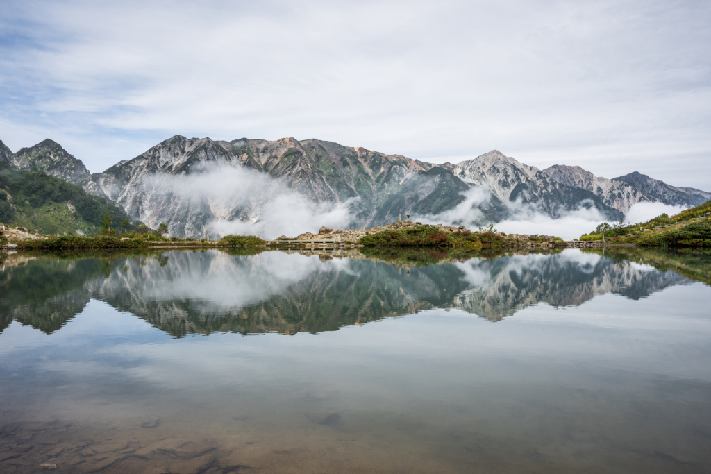 The pond is buried under a thick carpet of snow for a good six months of the year, but as the warm fronts move in and the last dregs of winter disappear, the glassy surface begins to reveal itself — usually around mid- to late June. Once it has completely thawed, its crystal-clear waters reveal an unbeatable view. Reflected in the pond you will see the three peaks of the Hakuba Sanzan: Hakuba Yarigatake, Shakushi-dake and Shirouma-dake. As you stand here, look over your shoulder and you may even catch a glimpse of Mount Fuji in the far distance if the sky is clear.