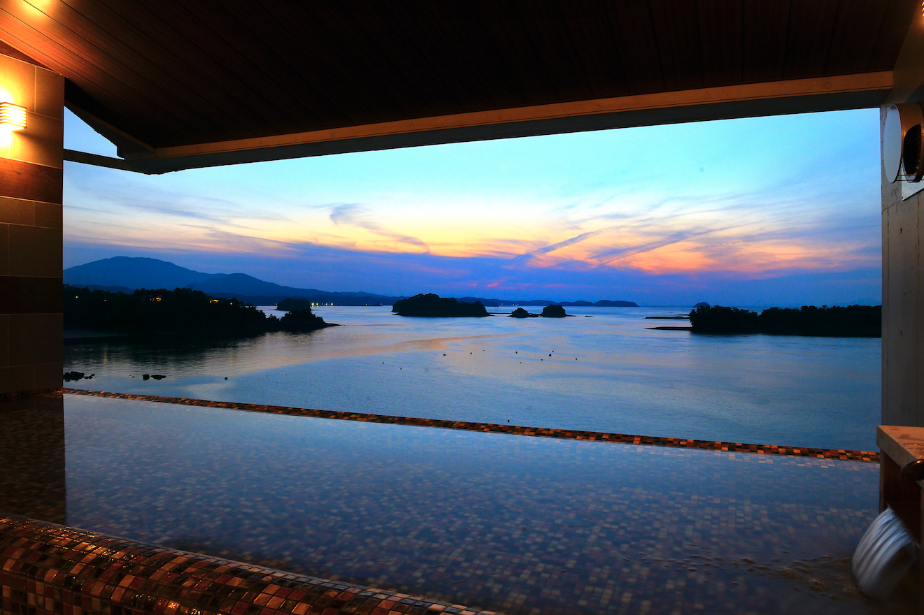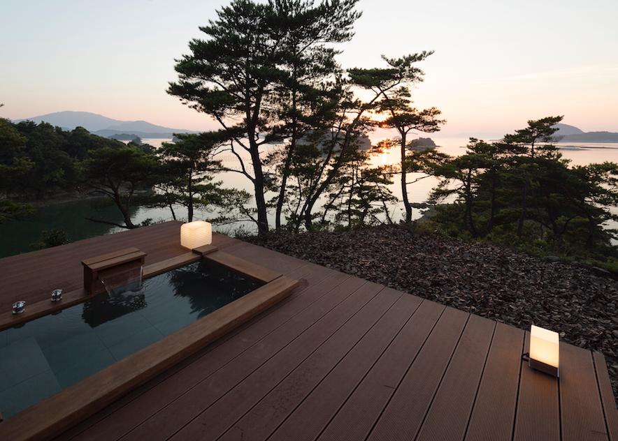 The private outdoor baths located in every room offer stunning views of a seascape selected as one of the top 100 sunset views in all of Japan. The baths are fed with natural spring water from the Amakusa Matsushima Hot Spring, known for its salty composition that helps keep complexions healthy and fresh, and provides relief from joint and muscle pain.
